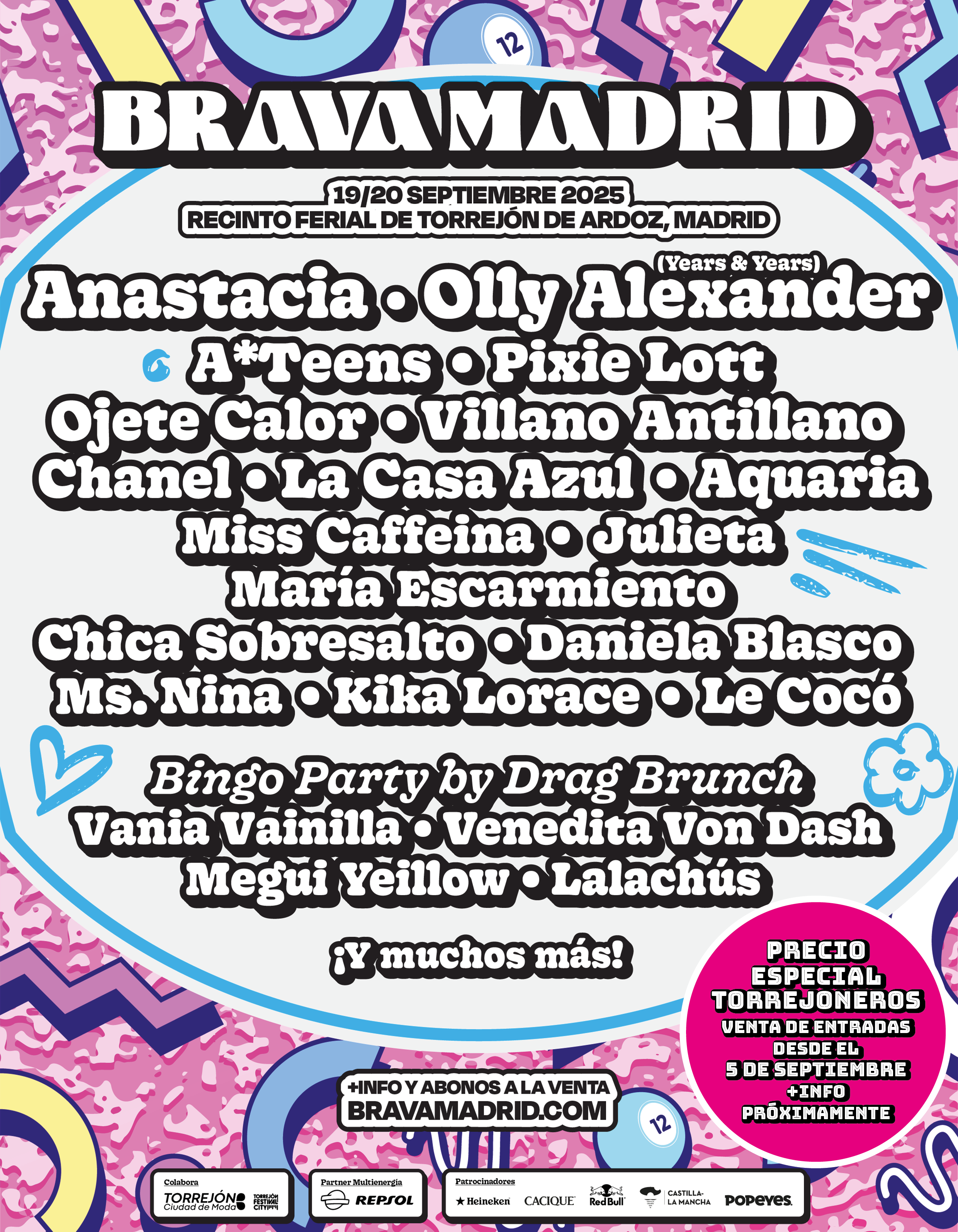 Brava Madrid contará con el pop de la afamada cantante norteamericana Anastacia, del británico Olly Alexander y de las eurovisivas Chanel y Daniela Blasco, con la referencia internacional urbana de Villano Antillano, con el indie de Miss Caffeína y La Casa Azul, o entre otros con el humor irreverente de Ojete Calor, todo ello animado por Lalachús y la Bingo Party con afamadas Drag Queens.