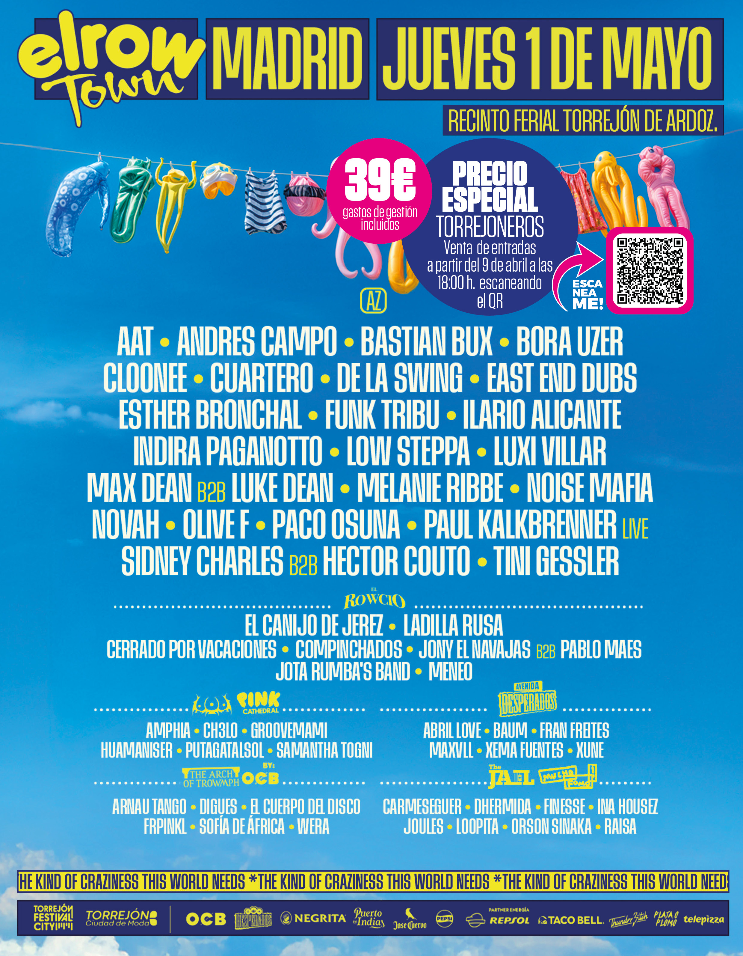 Para el festival internacional elrow Town, que tendrá lugar el próximo 1 de mayo en el Parque de Ocio-Recinto Ferial de Torrejón de Ardoz, los torrejoneros ya pueden comprar ya las entradas con un descuento del 50%, al precio especial de 39 euros, gastos de gestión incluidos, en la página web ENTERTICKET en el apartado PRECIO ESPECIAL TORREJONEROS (https://www.enterticket.es/eventos/elrow-town-madrid-2025-torrejon-festival-city-197586).