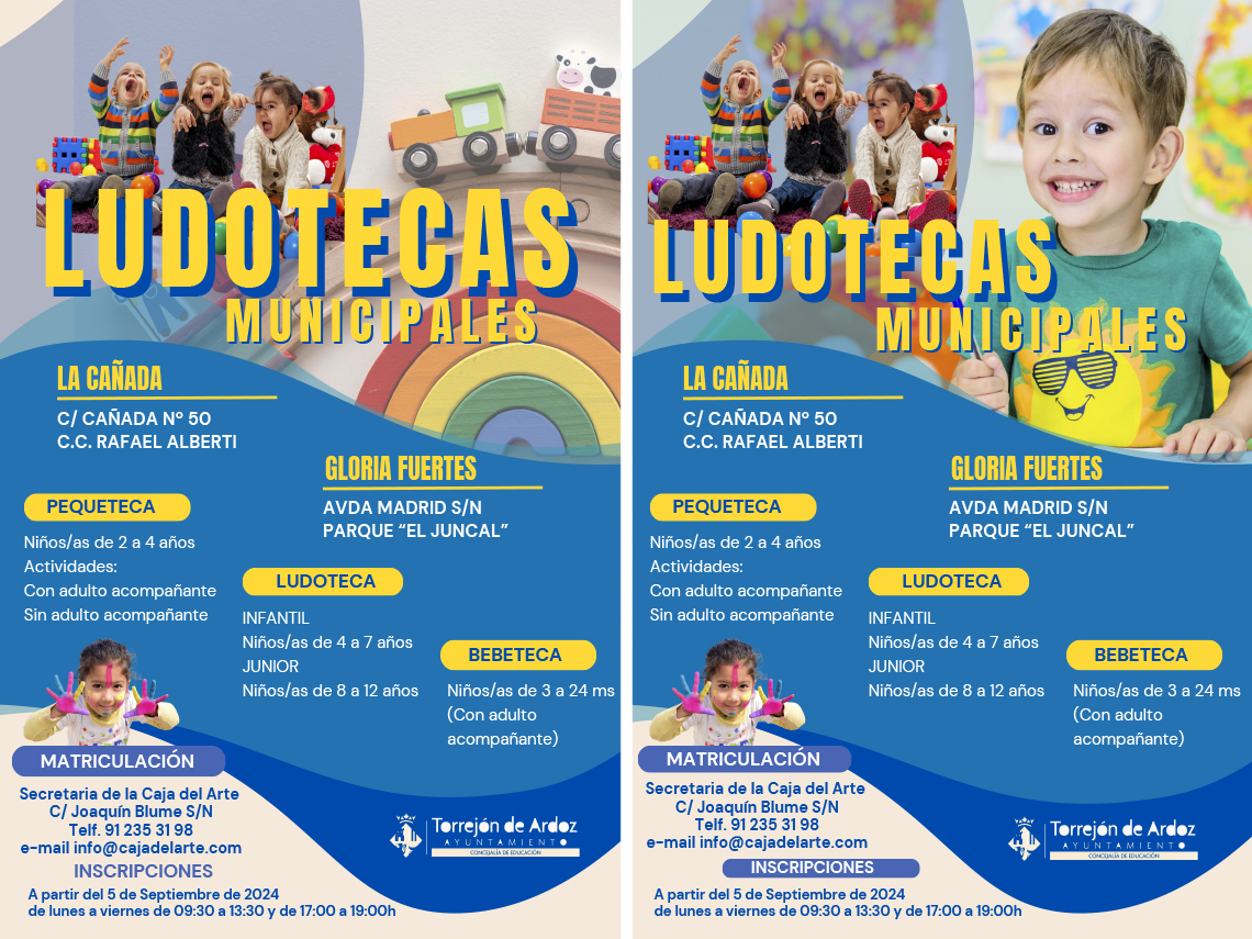 Por último, está la Ludoteca, conjunto de talleres que fomentan la estimulación lectora, musical, plástica, experimenta y explora e inglés, impartidos con una metodología activa y participativa. Dirigido a niños de 4 a 7 años (ludoteca infantil) y de 8 a 12 años (ludoteca junior). Los precios son de 37 euros/mes las dos sesiones semanales. Las inscripciones pueden realizarse en la Secretaría de La Caja del Arte (calle Joaquín Blume s/n). Para más información: teléfono 91.235.31.98 y correo info@cajadelarte.com