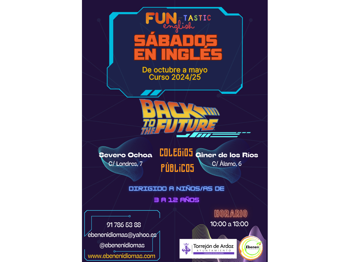 Además, están los Sábados de Inglés “Back to the future”, una actividad dirigida a niños de 3 a 12 años, impartida los sábados de 10:00 a 13:00 horas en los colegios Severo Ochoa y Giner de los Ríos. Es totalmente en inglés con una metodología elaborada para trabajar todas las habilidades del idioma, incentivando el desarrollo de capacidades orales y escritas. Se divide en tres trimestres. El precio es de 42 euros mensuales y para más información en el teléfono 91 786 53 88.