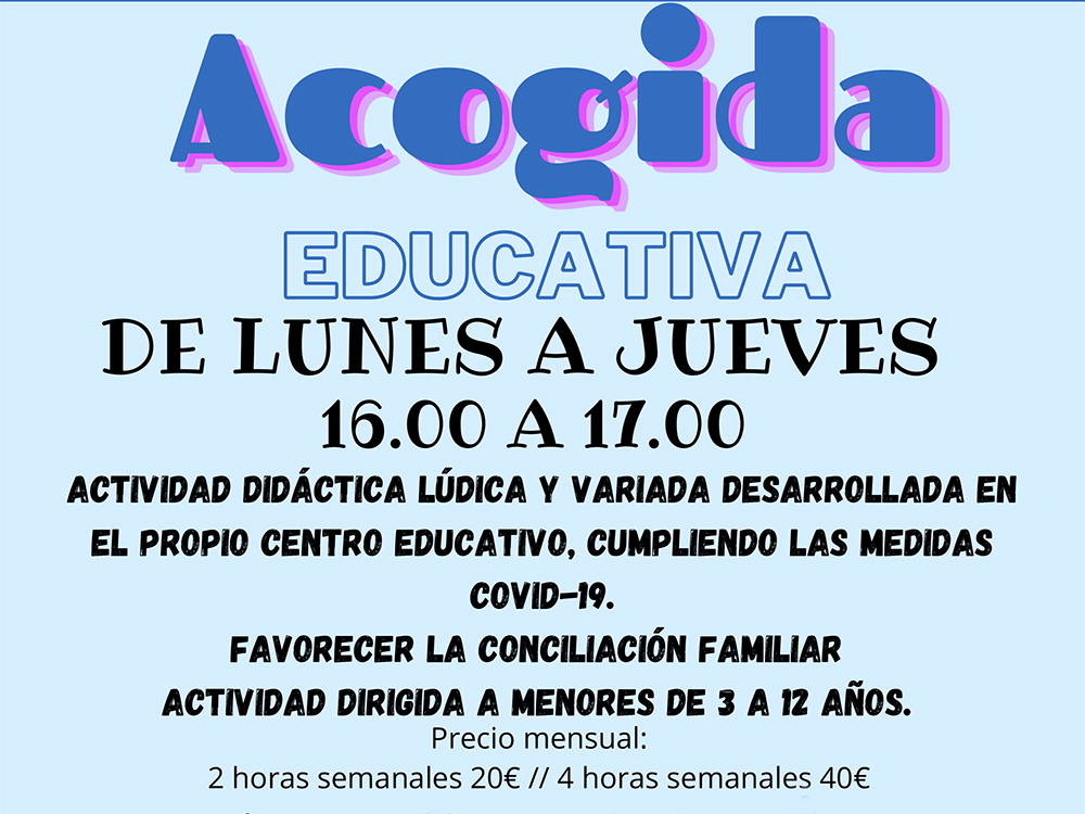 • Se trata de “Acogida Educativa”, una actividad didáctica lúdica y variada que tiene lugar de lunes a jueves en horario de 16:00 a 17:00 horas