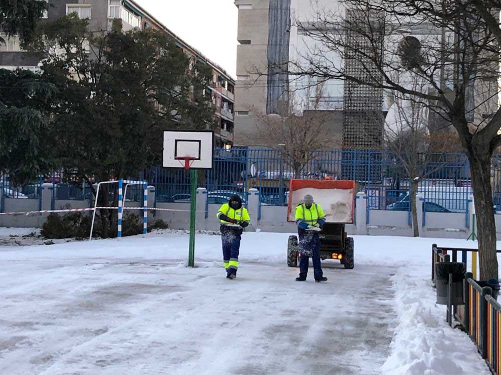 El Ayuntamiento de Torrejón de Ardoz está despejando de hielo y nieve los accesos exteriores a los colegios y escuelas infantiles públicas y creando caminos en el interior ante el comienzo de las clases el miércoles 20 de enero