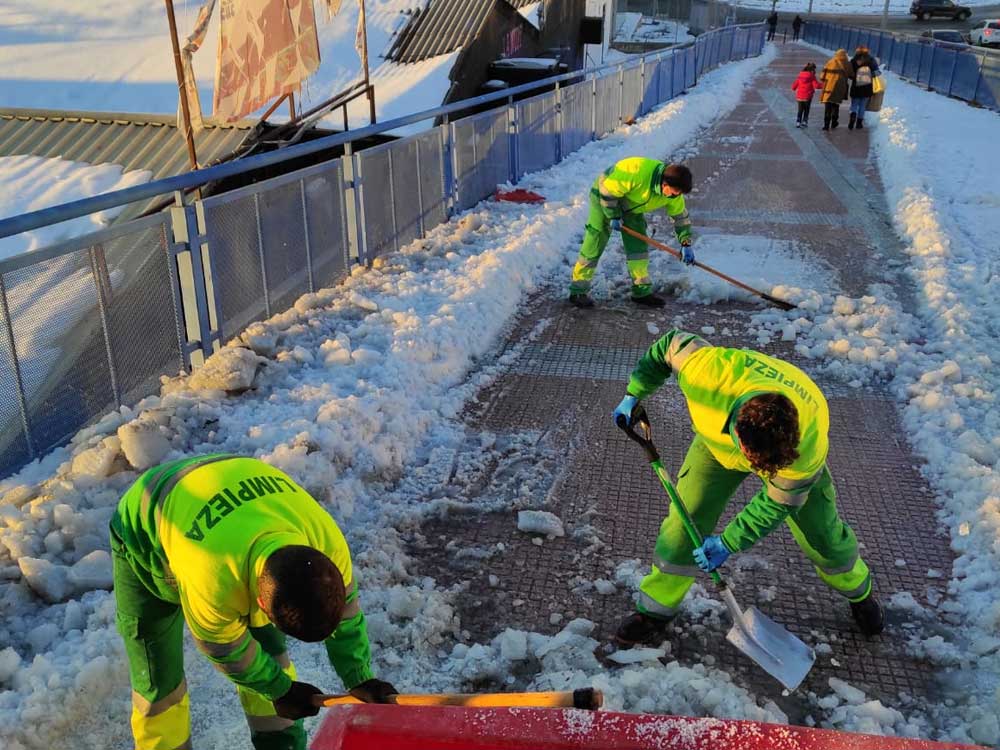 Para mejorar la movilidad de los peatones se están intensificando los trabajos con el objetivo de ir recuperando la normalidad ante la gran nevada. Un amplio dispositivo humano y técnico desarrolla una labor constante para retirar de las aceras parte el duro hielo que se ha acumulado por los grandes espesores de nieve de hasta 60 centímetros registrados en algunas zonas de la ciudad. En tal sentido, también agradecer a las comunidades de propietarios, comerciantes y vecinos a título particular, como están colaborando en la limpieza del hielo y nieve de las aceras, a lo que está contribuyendo la cesión de palas y la entrega de sal realizada por el Ayuntamiento.