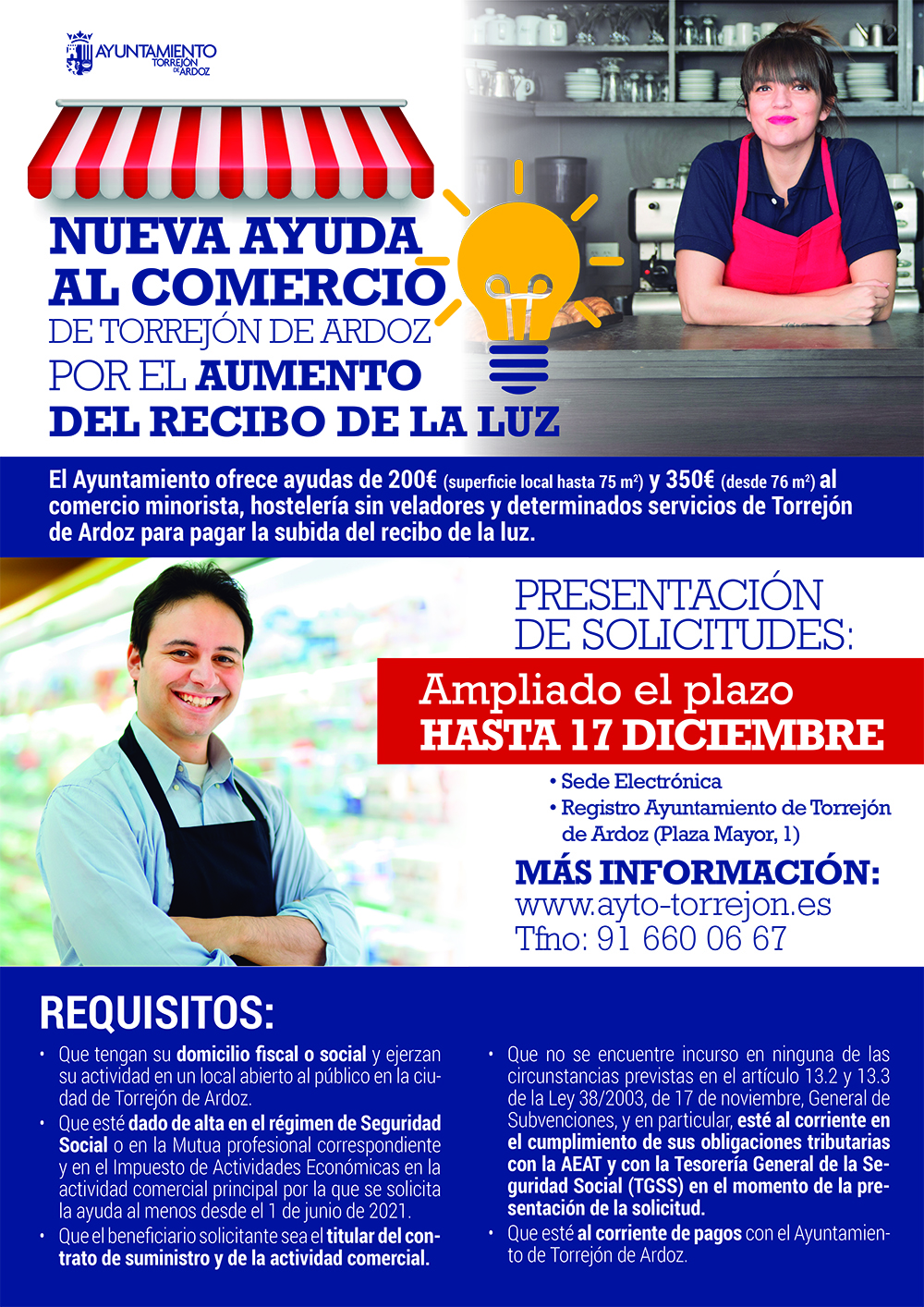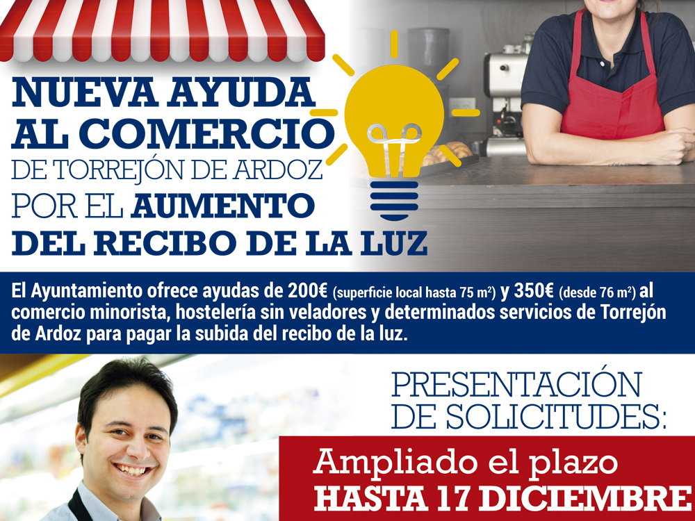 Ampliado hasta este viernes 17 de diciembre el plazo de presentación de las ayudas de 200 y 350 euros que el Ayuntamiento de Torrejón de Ardoz ofrece al comercio minorista, hostelería sin veladores y otros servicios para ayudar a pagar la subida del recibo de la luz. Se trata de subvenciones de 200 euros (para locales con una superficie de hasta 75 m2) y de 350 euros (para locales desde 76 m2).