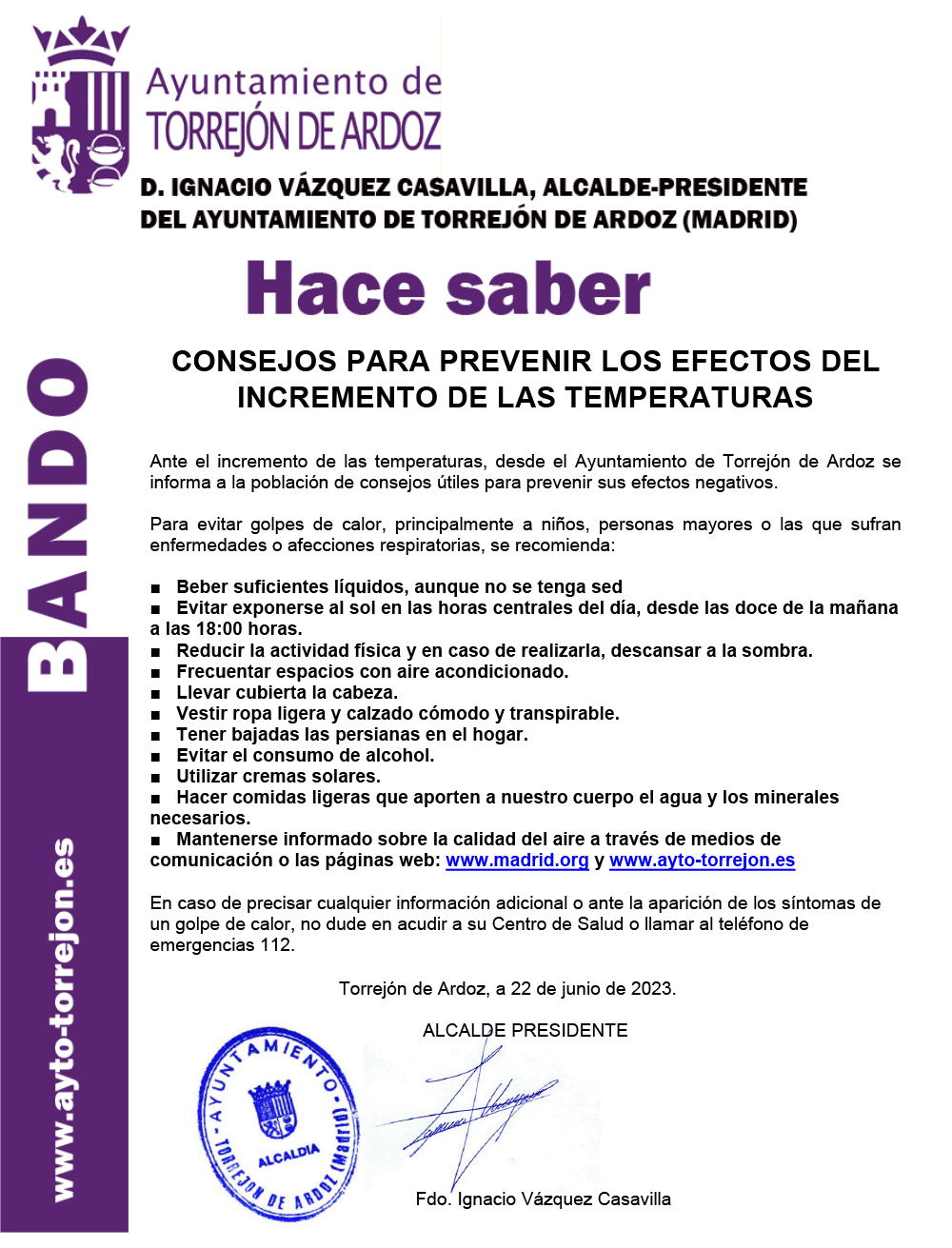 • A causa las altas temperaturas que se están registrando estos días, con máximas que superan los 37º, el Ayuntamiento de Torrejón de Ardoz quiere informar a los vecinos de consejos útiles para prevenir los efectos negativos del calor. Los colectivos con más riesgos en sufrir las consecuencias de las altas temperaturas son los niños menores de cuatro años, los enfermos y las personas mayores