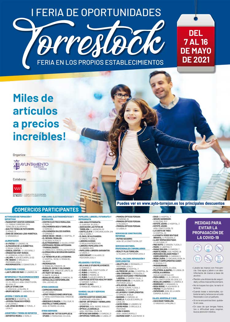 Arranca la I Feria de Oportunidades “Torrestock”, que se celebrará en Torrejón de Ardoz desde hoy hasta el próximo 16 de mayo con importantes descuentos y ofertas en más de 100 comercios. Gracias a esta iniciativa, los vecinos podrán disfrutar de grandes promociones y rebajas en los más de 100 comercios participantes en el horario comercial de cada establecimiento.