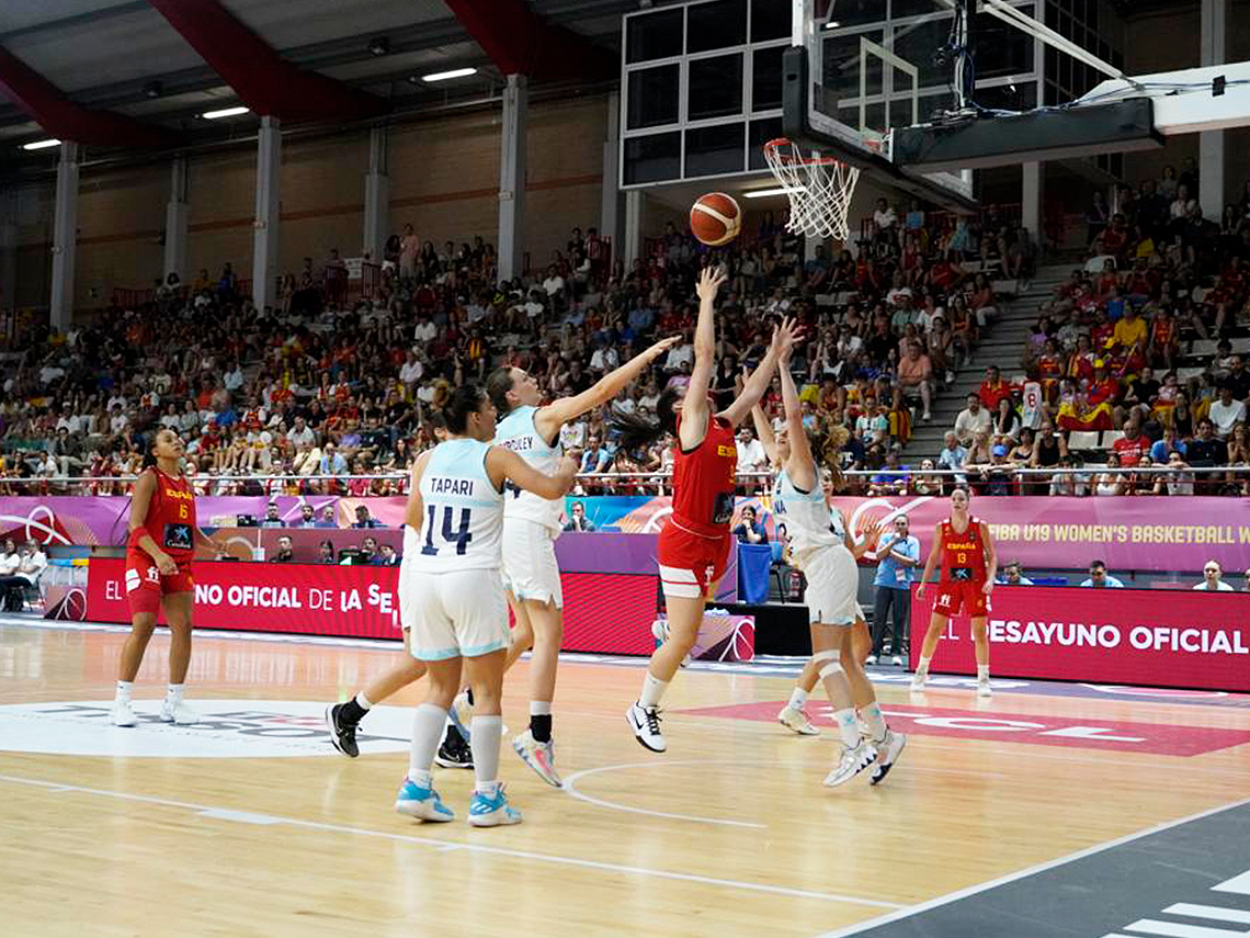 Torrejón de Ardoz, 19 de julio de 2023. España finalizó como primera clasificada de su grupo al vencer ayer a Argentina por 74-35 en el encuentro que tuvo lugar en el Pabellón Jorge Garbajosa de Torrejón de Ardoz y que registró una excelente entrada.