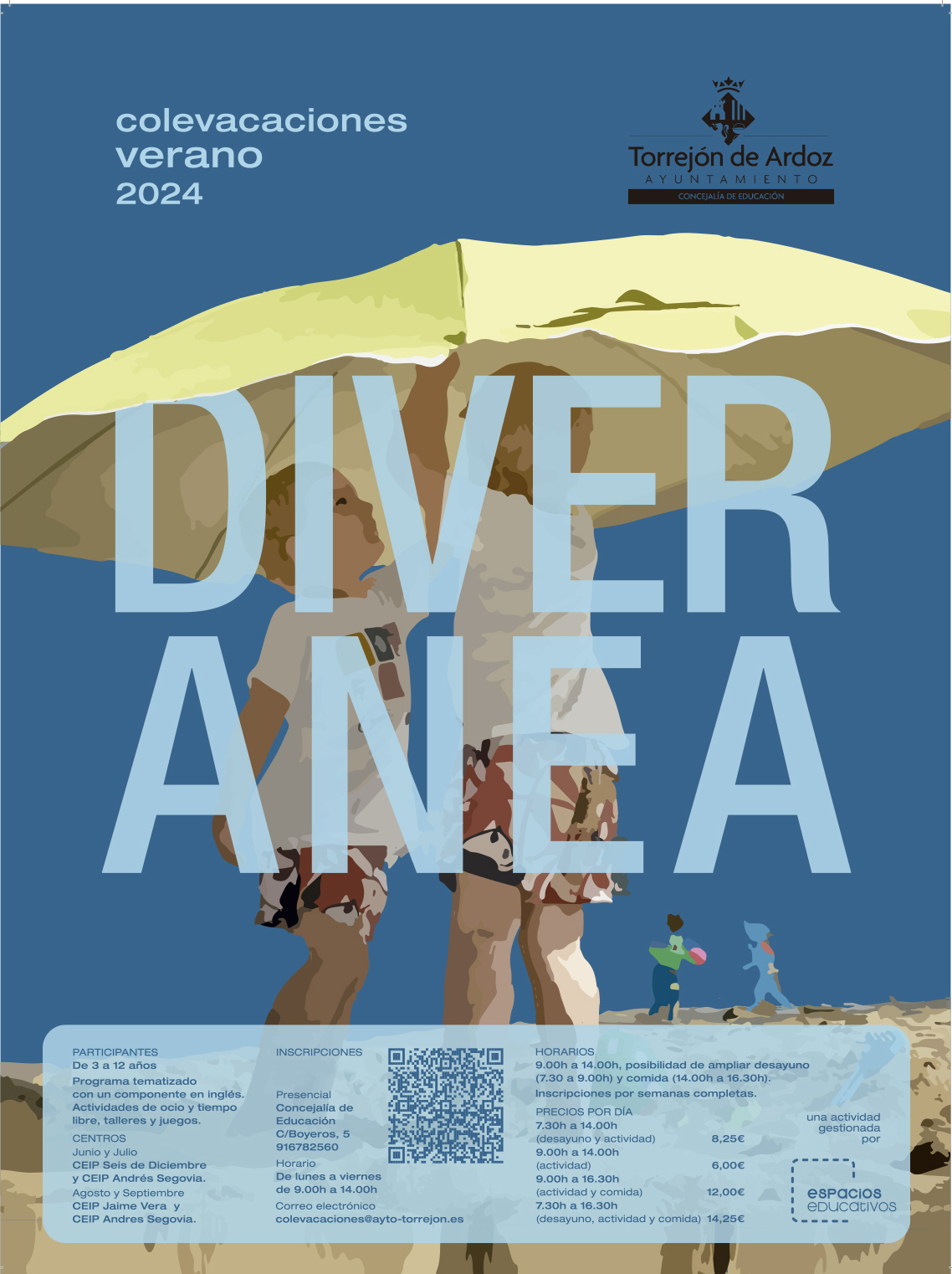 Torrejón de Ardoz, 14 de agosto de 2024. Las inscripciones se pueden realizar presencialmente, en horario de lunes a viernes de 9:00 a 14:00 horas, en la sede de la Concejalía de Educación (C/ Boyeros) o de manera telemática descargando el formulario en: www.ayto-torrejon.es/tramites/educacion/colevacaciones-verano-2024 o solicitar su envío en el teléfono de la Concejalía de Educación, 91 678 25 60.