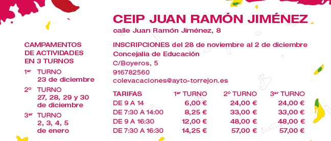 • Esta iniciativa está dirigida a los niños de entre 3 y 12 años y se realizará en el colegio Juan Ramón Jiménez. Los interesados podrán realizar la inscripción hasta el próximo 2 de diciembre o hasta agotar plazas en la Concejalía de Educación (calle Boyeros, 5) en un horario de lunes a viernes de 9:00 a 14:00 horas, a través del teléfono 91 678 25 60 y en colevacaciones@ayto-torrejon.es