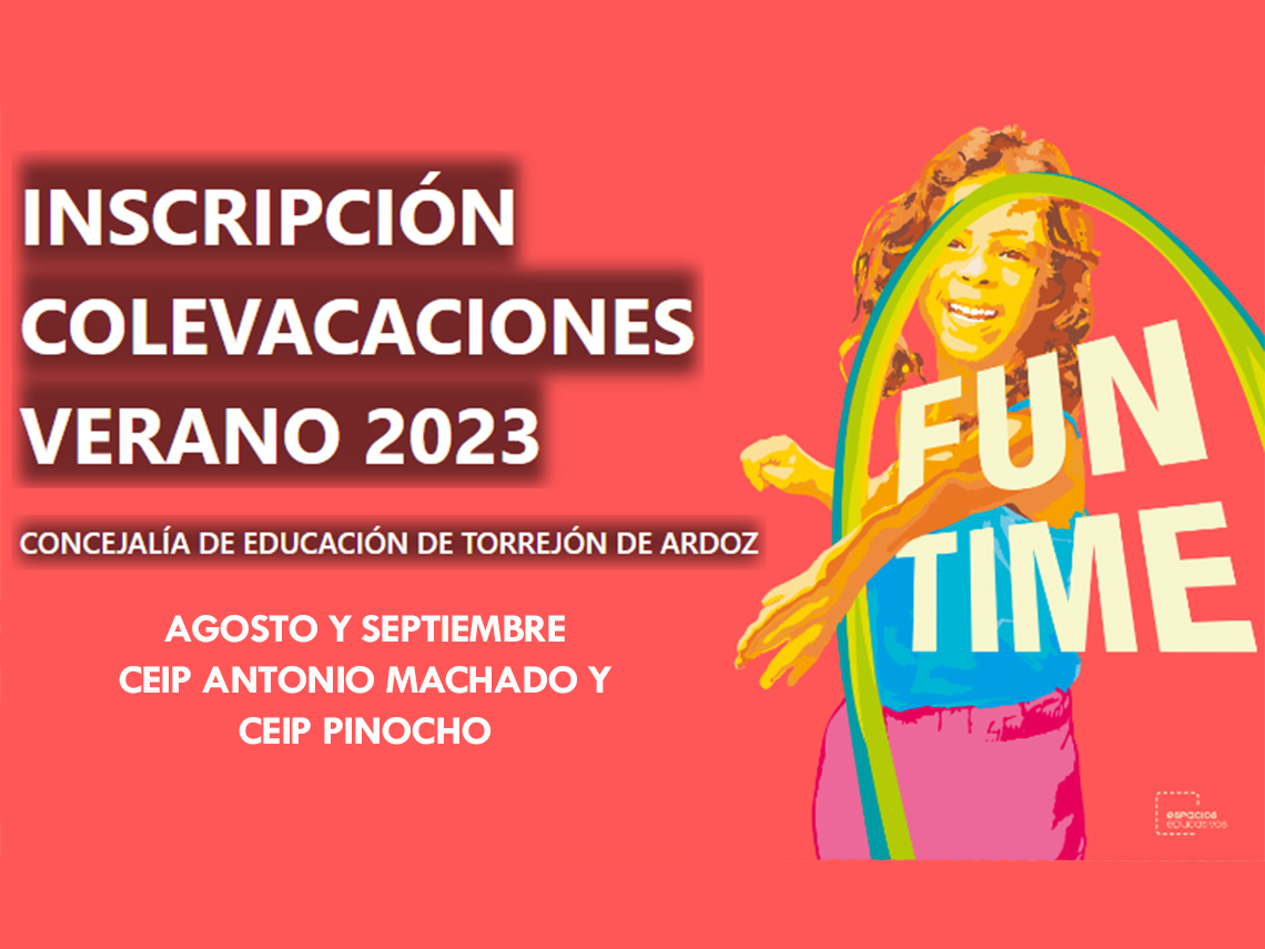 Torrejón de Ardoz, 14 de agosto de 2023. Las Colevacaciones están dirigidas a menores de 3 a 12 años y en los colegios Antonio Machado y Pinocho. Los horarios son de 9:00 a 14:00 horas, con posibilidad de ampliar a desayuno (7:30 a 9:00 horas) y comida (14:00 a 16:30 horas). Se pueden solicitar los periodos por semanas completas o quincenas. Las inscripciones se pueden realizar, hasta agotar plazas, de forma presencial en la Concejalía de Educación (calle Boyeros, 5) y a través del teléfono 91 678 25 60, en horario de lunes a viernes de 9:00 a 14:00 horas o bien enviando un correo a colevacaciones@ayto-torrejon.es Más información, en este enlace: https://www.ayto-torrejon.es/tramites/educacion/solicitud-colevacaciones-verano-2023