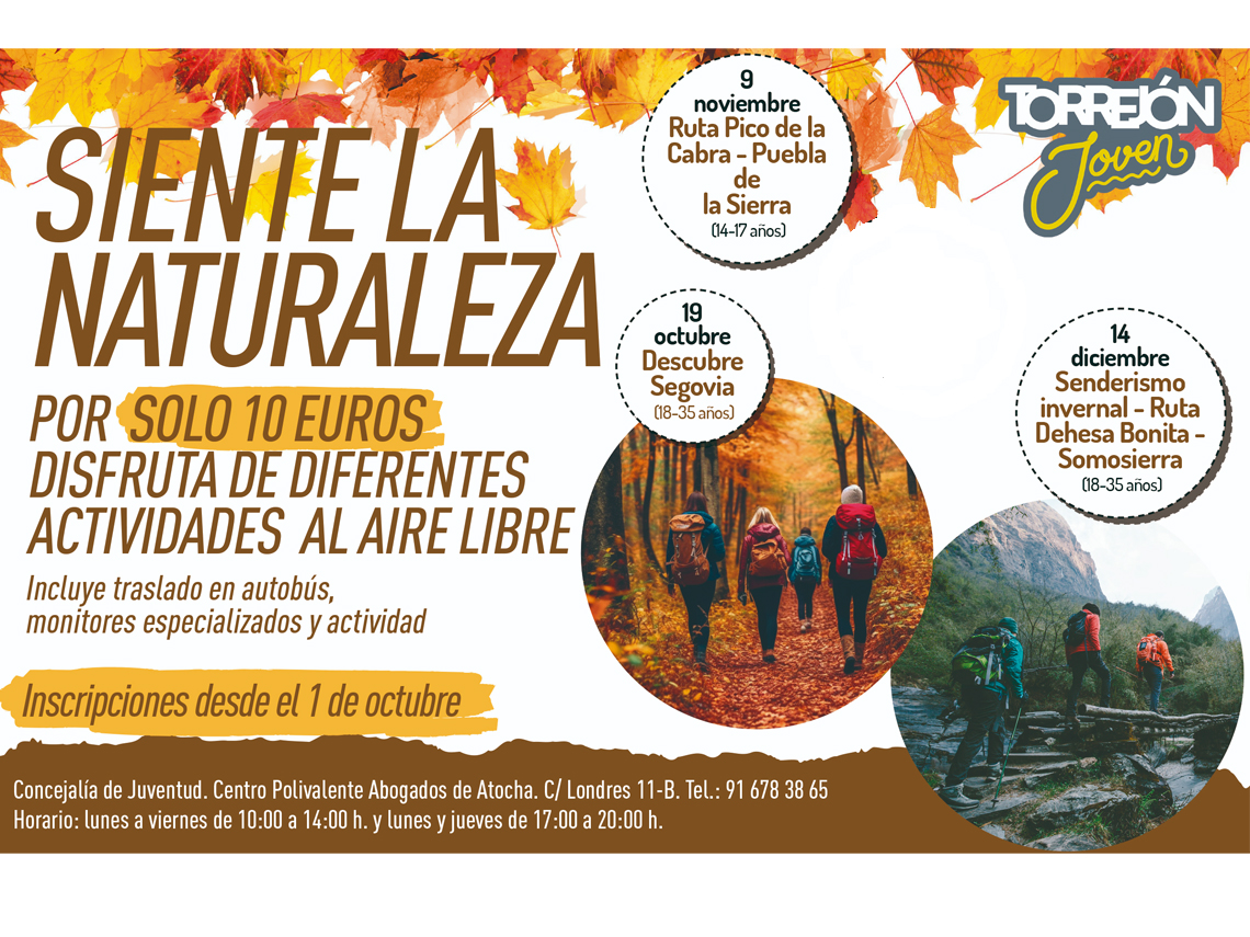 Torrejón de Ardoz, 14 de octubre de 2024. Hay que recordar que aún quedan plazas para las atractivas propuestas con las que llega esta nueva temporada del programa “Aula de Ocio y Naturaleza” de la Concejalía de Juventud del Ayuntamiento de Torrejón de Ardoz. “Descubre Segovia”, la ruta “Pico De La Cabra” y “Senderismo invernal” son las actividades al aire libre para las que todavía quedan plazas disponibles. Están especialmente diseñadas para los jóvenes y tienen un precio de tan sólo 10 euros. Las inscripciones se pueden realizar hasta cubrir plazas en la Concejalía de Juventud, situada en el Centro Polivalente Abogados de Atocha (calle Londres 11B) en horario de lunes a viernes de 10:00 a 14:00 horas y lunes y jueves también de 17:00 a 20:00 horas.