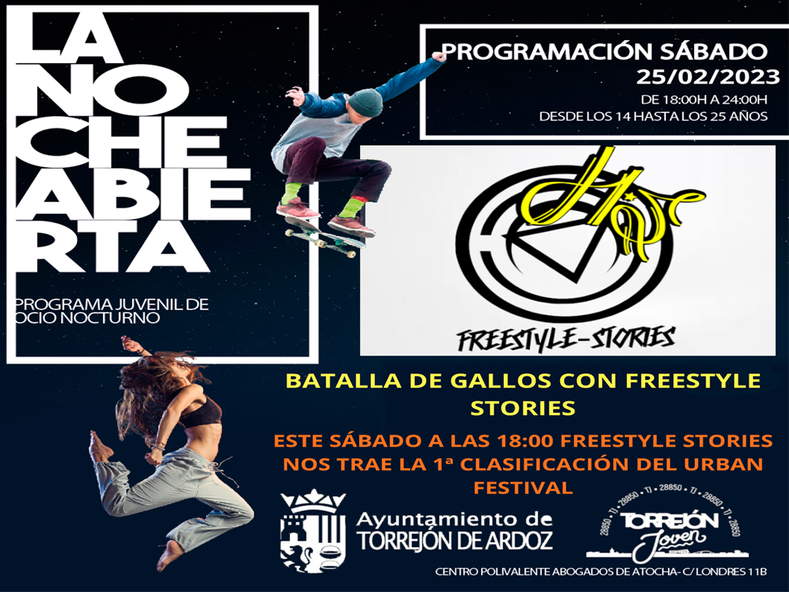 Batalla de gallos con Freestyle Stories protagonizan “La Noche Abierta” de mañana sábado, 25 de febrero. De esta cita saldrá la primera clasificación del Urban Festival y tendrá lugar a partir de las 18:00 horas en el Centro Polivalente Abogados de Atocha. Además, se podrá disfrutar del resto de actividades que hay de forma habitual, como los juegos de mesa, en colaboración con la Asociación Juvenil Místicos de Arkat, partidas de PS4, futbolín o ping-pong. La entrada es gratuita hasta completar aforo.