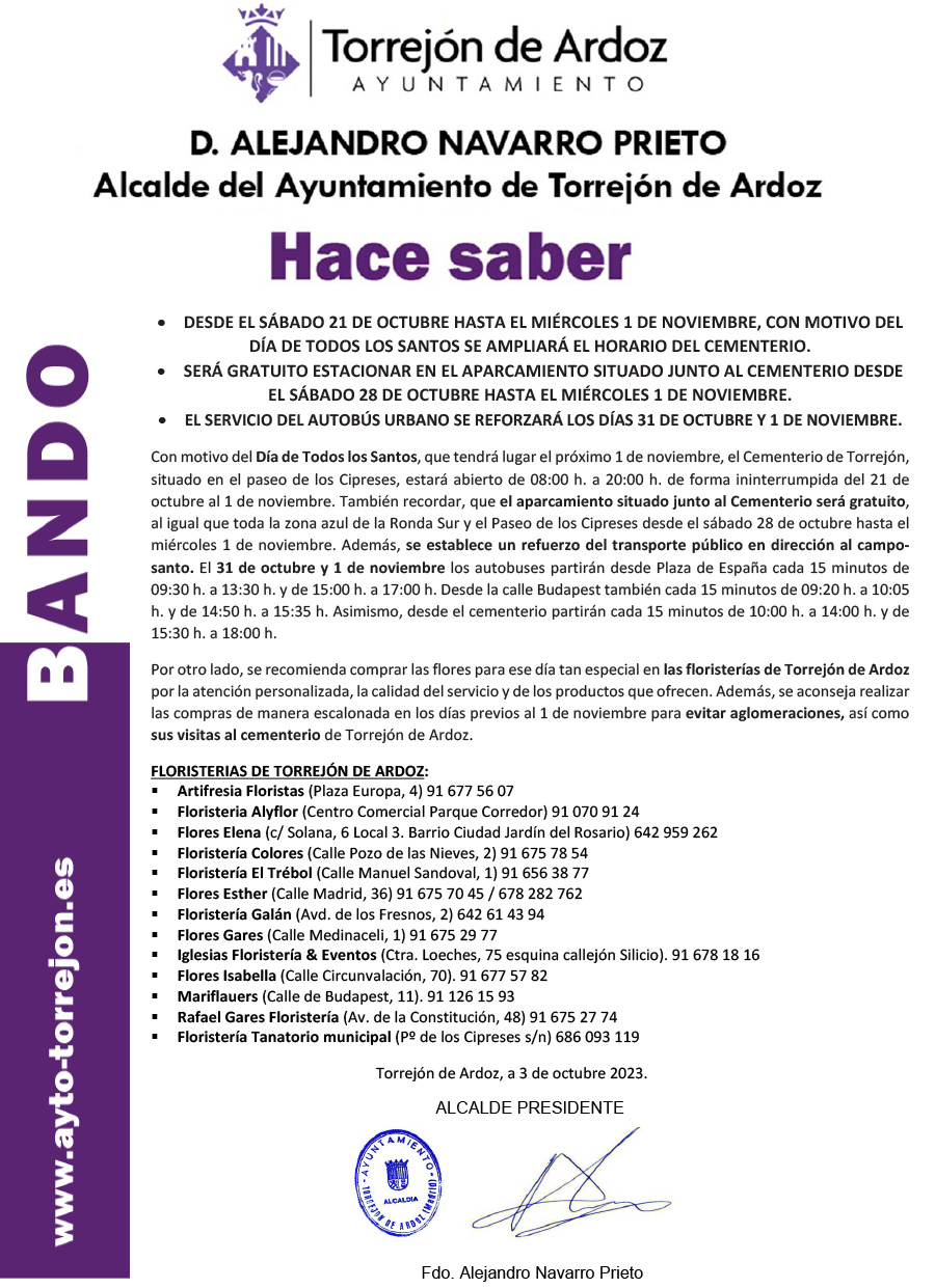 Torrejón de Ardoz, 25 de octubre de 2023. Además, se establece un refuerzo del transporte público en dirección al camposanto. El 31 de octubre y 1 de noviembre los autobuses partirán desde Plaza de España cada 15 minutos de 9:30 a 13:30 horas y de 15:00 a 17:00 horas. Desde la calle Budapest también cada 15 minutos de 9:20 a 10:05 horas y de 14:50 a 15:35 horas. Asimismo, desde el cementerio partirán cada 15 minutos de 10:00 a 14:00 horas y de 15:30 a 18:00 horas.