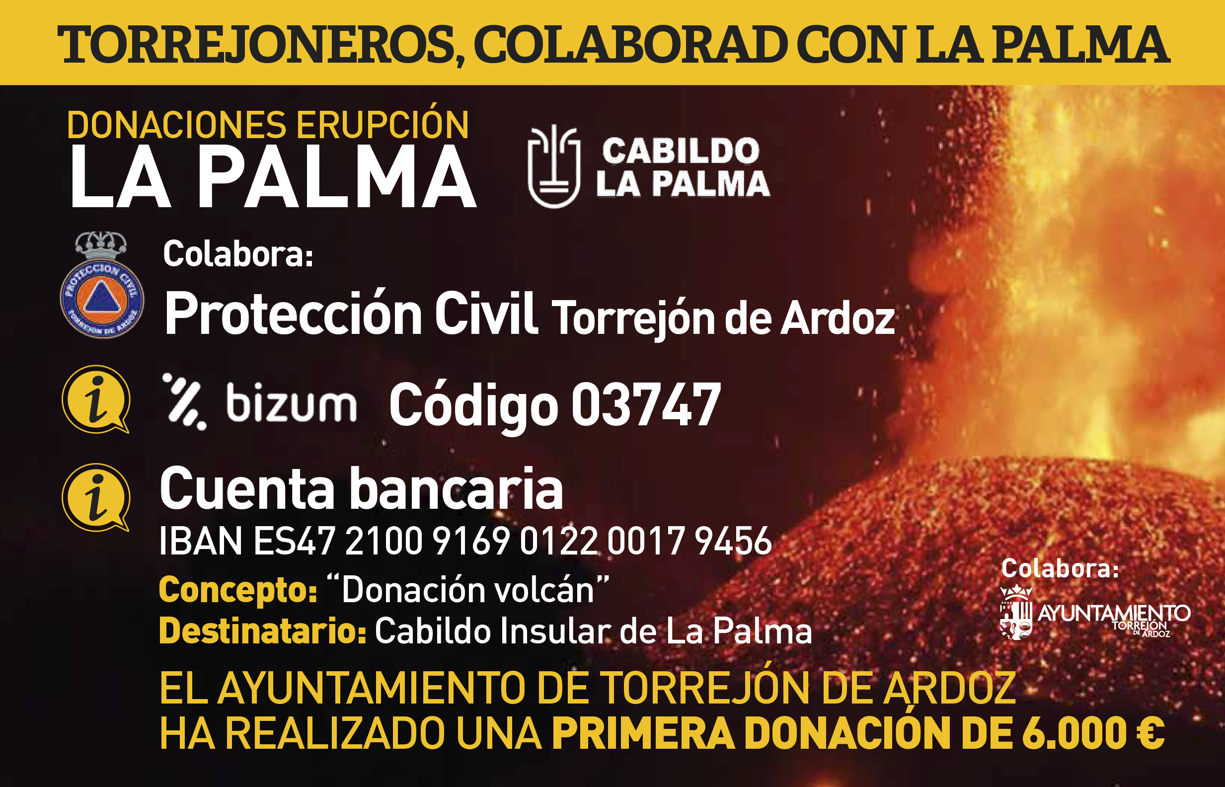 Continúa el apoyo del Ayuntamiento a los afectados por el volcán en la zona de Cabeza de Vaca realizando una primera donación de 6.000€ e invitando a los torrejoneros que deseen hacer aportaciones económicas a que lo hagan a través de la cuenta oficial
