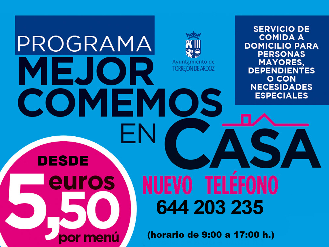 Continúa el programa municipal “Mejor comemos en casa” dirigido a personas mayores, dependientes o con necesidades especiales, que ofrece comidas a domicilio desde 5,50 euros, siendo gratuito para personas de estos colectivos que no tengan recursos. Para beneficiarse de este servicio hay que solicitarlo a través del teléfono 644 203 235 (aviso con 24 horas para cancelación o modificación).