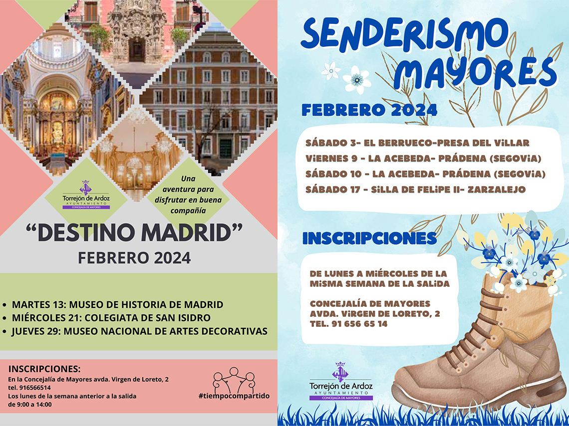 • Así, continúa “Destino Madrid”. Se trata de paseos culturales por Madrid, donde los mayores torrejoneros conocerán curiosidades y anécdotas de la capital sobre el terreno, con una variada oferta de visitas, cuyas próximas citas serán el miércoles 21 de febrero, a la Colegiata de San Isidro y el jueves 29 de febrero, al Museo Nacional de Artes Decorativas. Las inscripciones pueden realizarse en la Concejalía de Mayores (avenida Virgen de Loreto, 2) y a través del teléfono 91 656 65 14, los lunes de la semana anterior a la salida de 9:00 a 14:00 horas