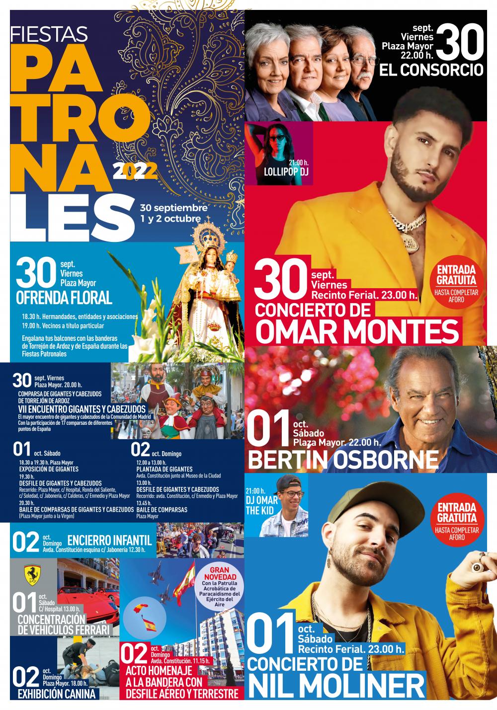• Los conciertos son las citas más multitudinarias, y este año lo seguirán siendo con dos actuaciones más juveniles en el Recinto Ferial a cargo del artista urbano del momento Omar Montes y la revelación musical Nil Moliner con la amenización previa y posterior de djs torrejoneros, Omar The Kid y Lollipop, entre otros; y dos conciertos más clásicos en la Plaza Mayor a cargo de consagrado grupo El Consorcio y el polifacético artista Bertín Osborne. El Consorcio sustituye al previsto Dúo Dinámico que ha suspendido sus conciertos por motivos de salud