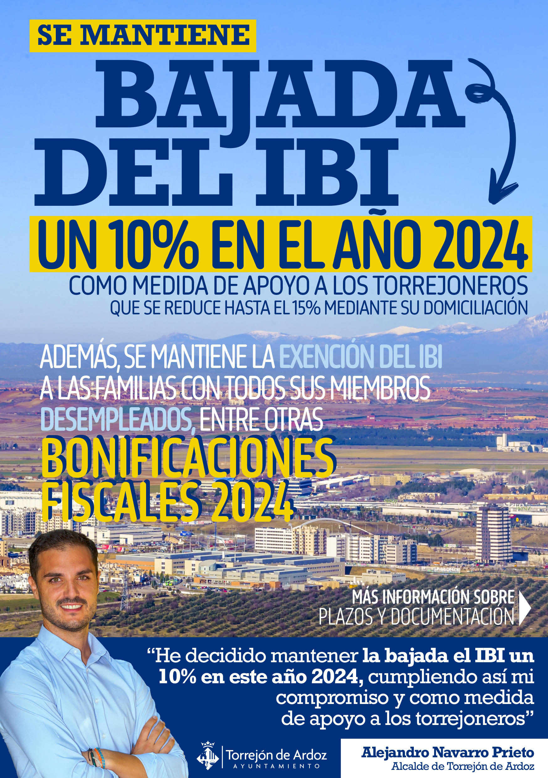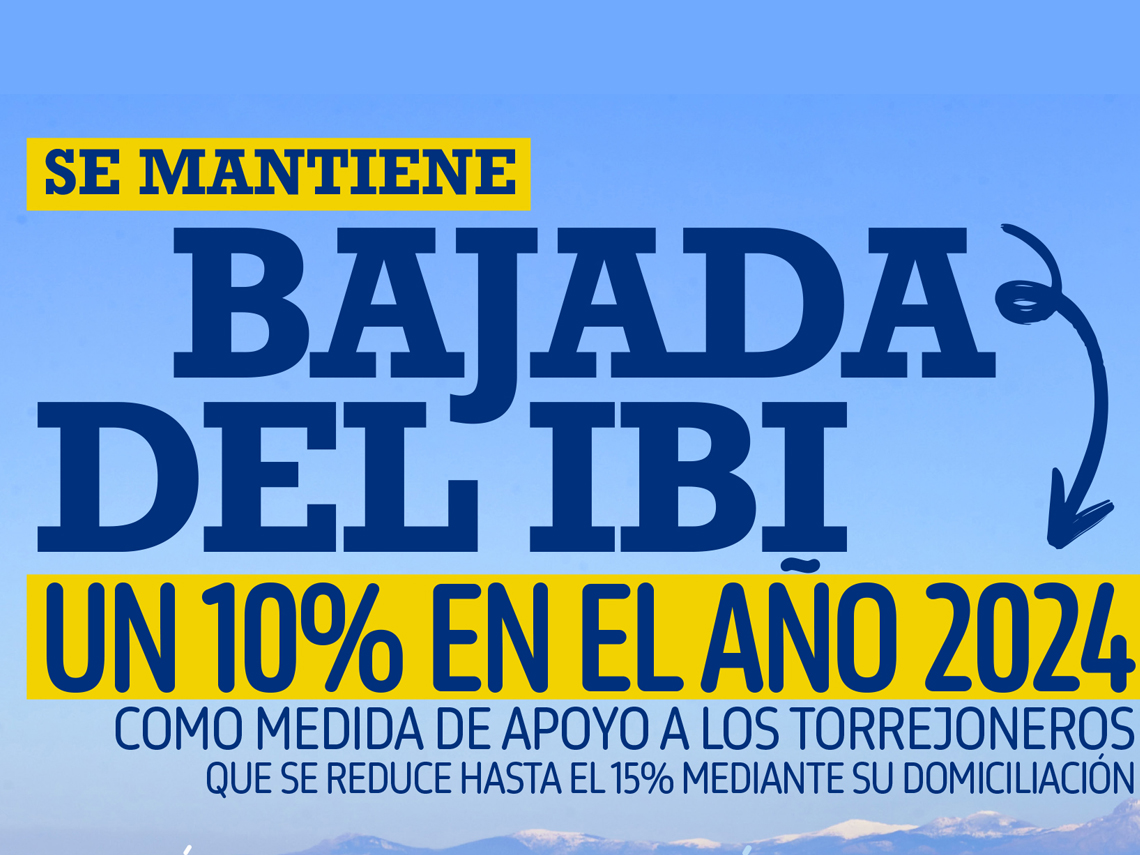 El alcalde de Torrejón de Ardoz, Alejandro Navarro Prieto, mantiene para este año 2024 la bajada del IBI un 10%, que se amplía al 15% para aquellos torrejoneros que lo domicilien. Además, continúa la exención del IBI a las familias con todos sus miembros desempleados, que los torrejoneros que lo deseen paguen éste en dos plazos, la bonificación para familias numerosas hasta el 90%, el fomento de empleo mediante la bonificación del ICIO a las empresas que contraten al menos a 10 torrejoneros y las bonificaciones para la instalación de paneles solares y puntos de recarga para vehículos eléctricos.