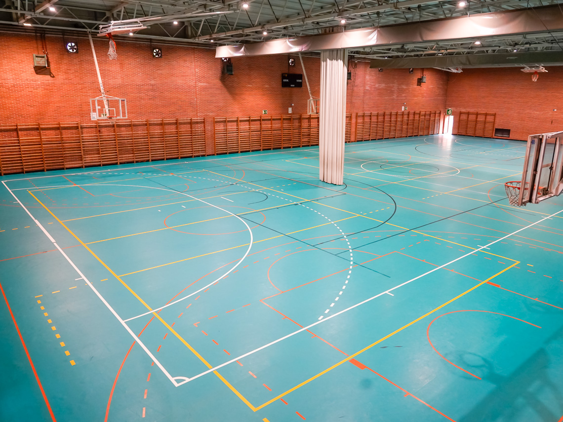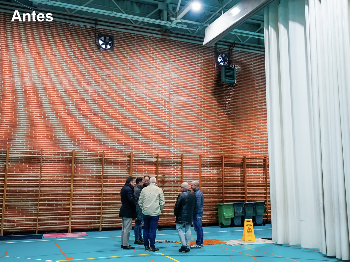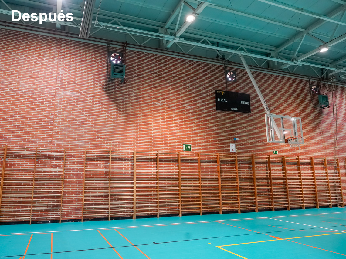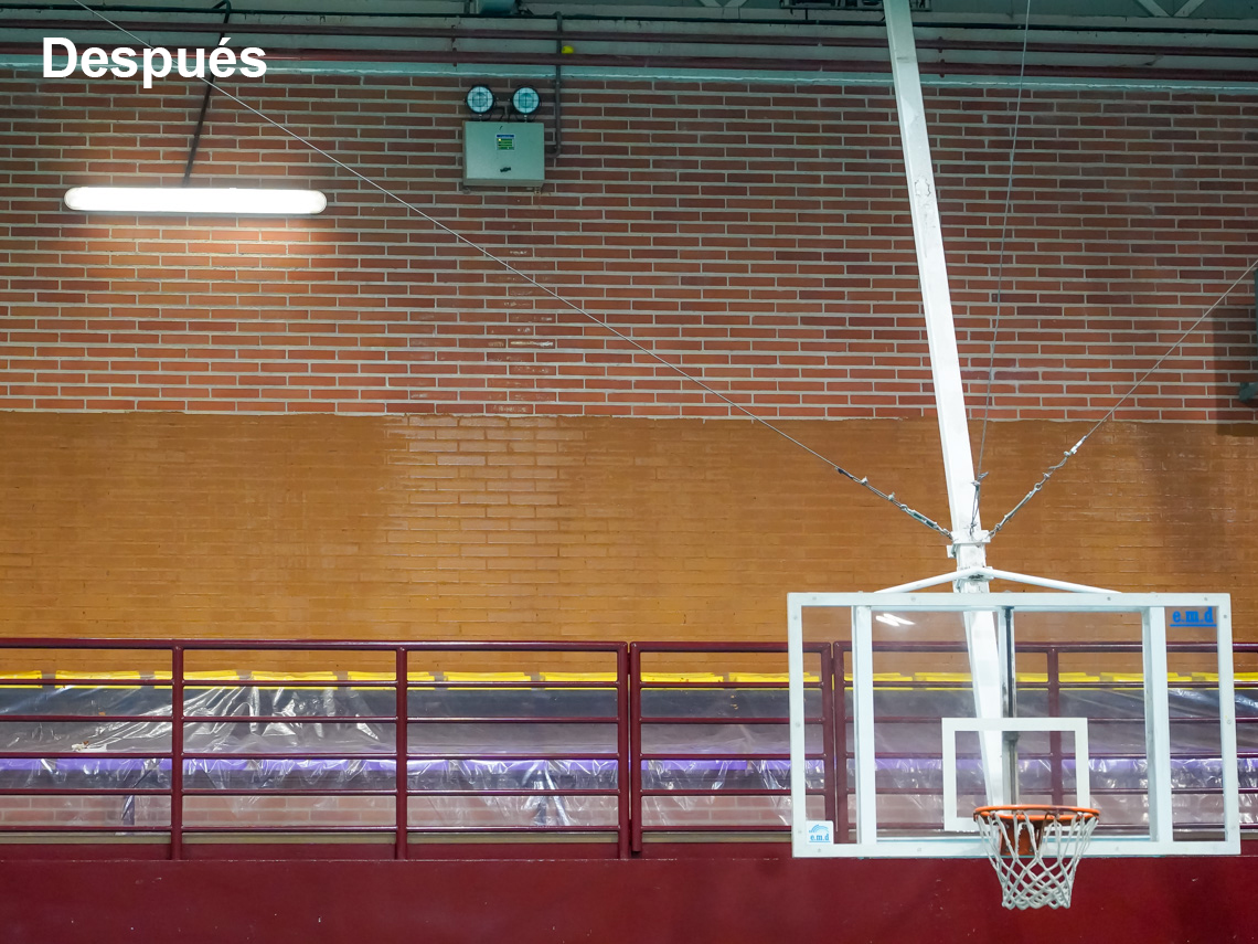 Torrejón de Ardoz, 16 de octubre de 2024. El objetivo de esta inversión ha sido arreglar el estado de las dos cubiertas que componen el Pabellón M4-Sonia Abejón. Por un lado, se ha sustituido la cubierta plana transitable en toda su superficie que presentaba un estado muy deteriorado por el paso del tiempo, que ocasionó goteras en la pista, vestuarios, aseos, oficinas. Por otro lado, también se ha reparado de manera integral la cubierta de chapa que cubre el pabellón, instalando otra cubierta, empleando una estructura metálica auxiliar para su apoyo, así como la instalación de nuevos canalones y bajantes que recogerán las aguas, evitando las goteras que se generaban en el interior.