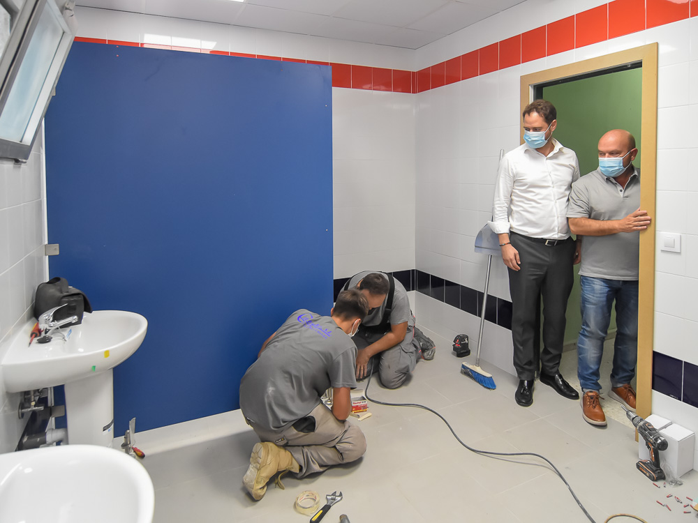 Torrejón de Ardoz, 19 de julio de 2021. Se están realizando mejoras, como la pintura de diferentes dependencias de los centros educativos, renovación de ventanas y cambio de suelos, reforma de aseos e instalaciones deportivas, o montaje de columpios, entre otras inversiones. En el caso del colegio Gabriel y Galán, que han visitado el alcalde, Ignacio Vázquez, y el concejal de Obras, Limpieza Urbana y Administración, Valeriano Díaz, se están reformando varios aseos, entre otras reparaciones.