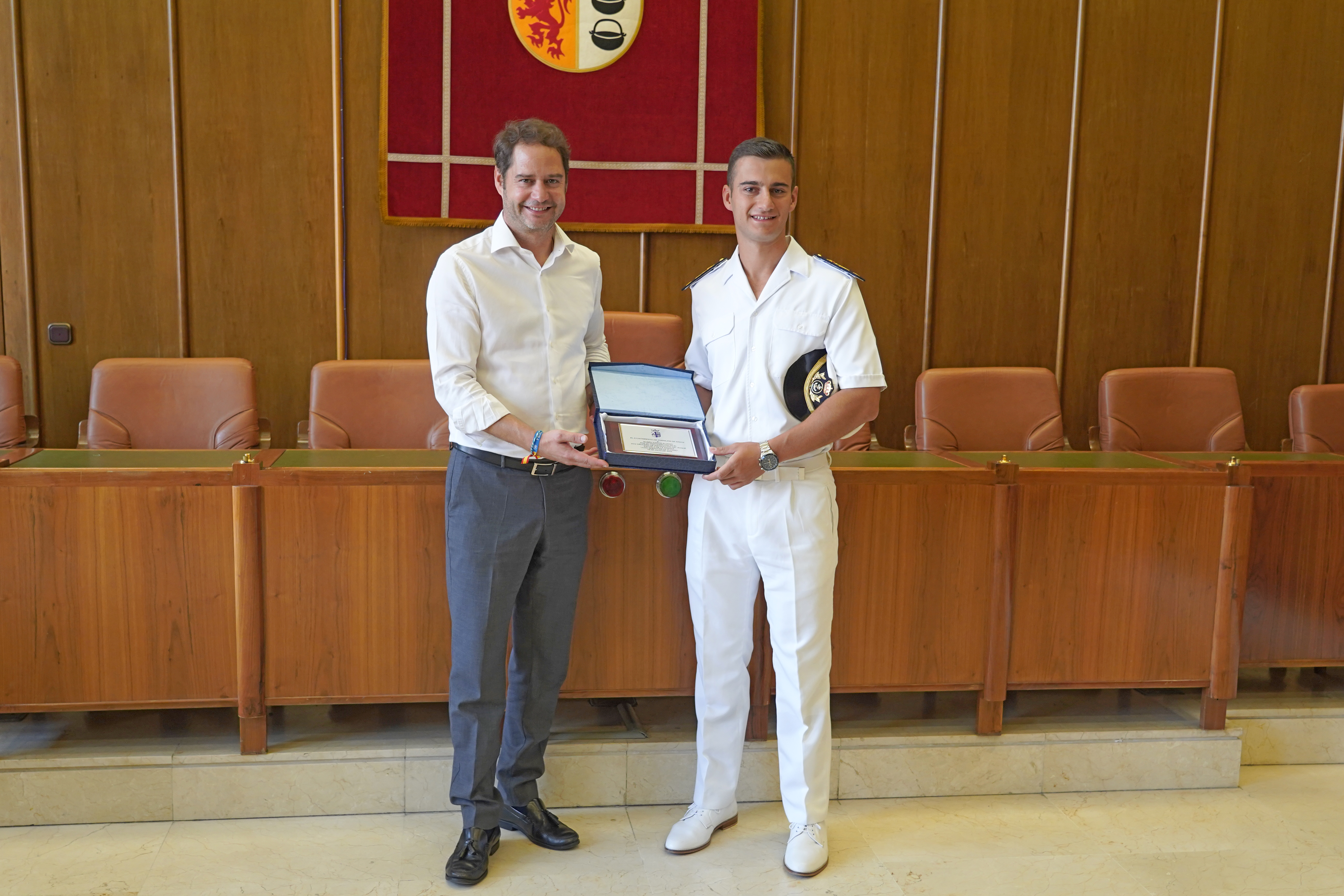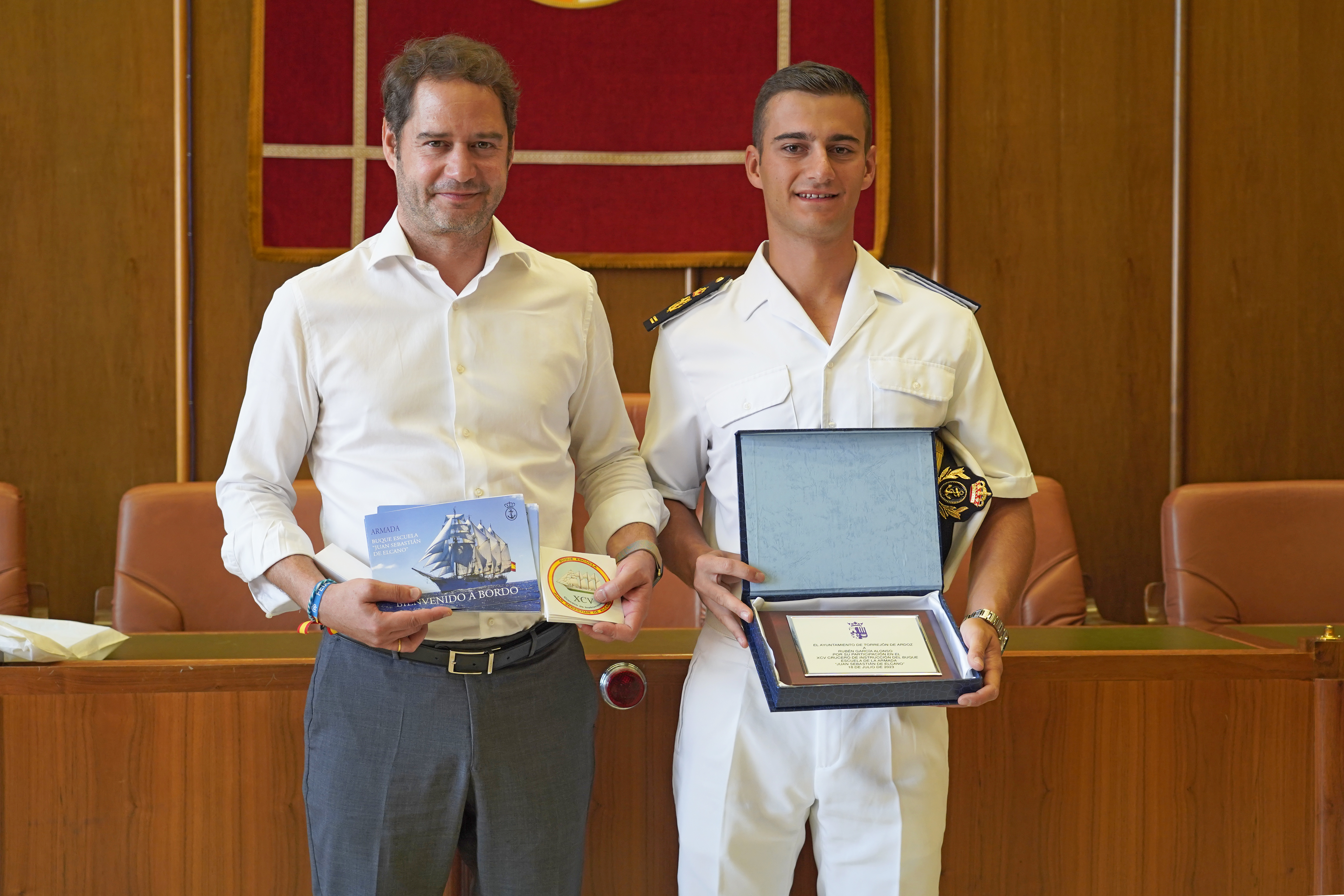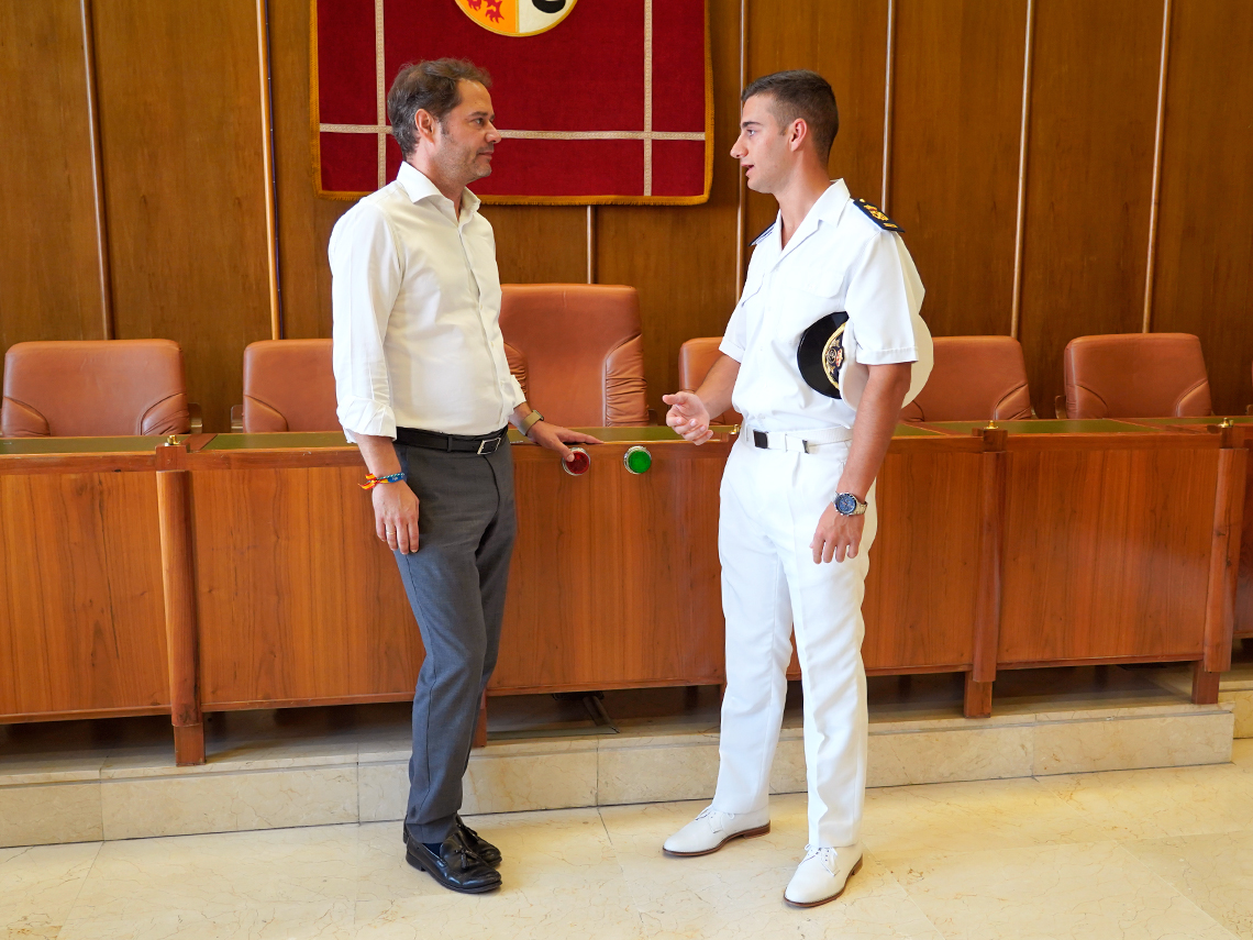 El alcalde ha entregado al joven torrejonero un recuerdo en nombre de la ciudad de Torrejón de Ardoz y le ha dado la enhorabuena por superar con éxito su formación a bordo del Buque Escuela de la Armada.