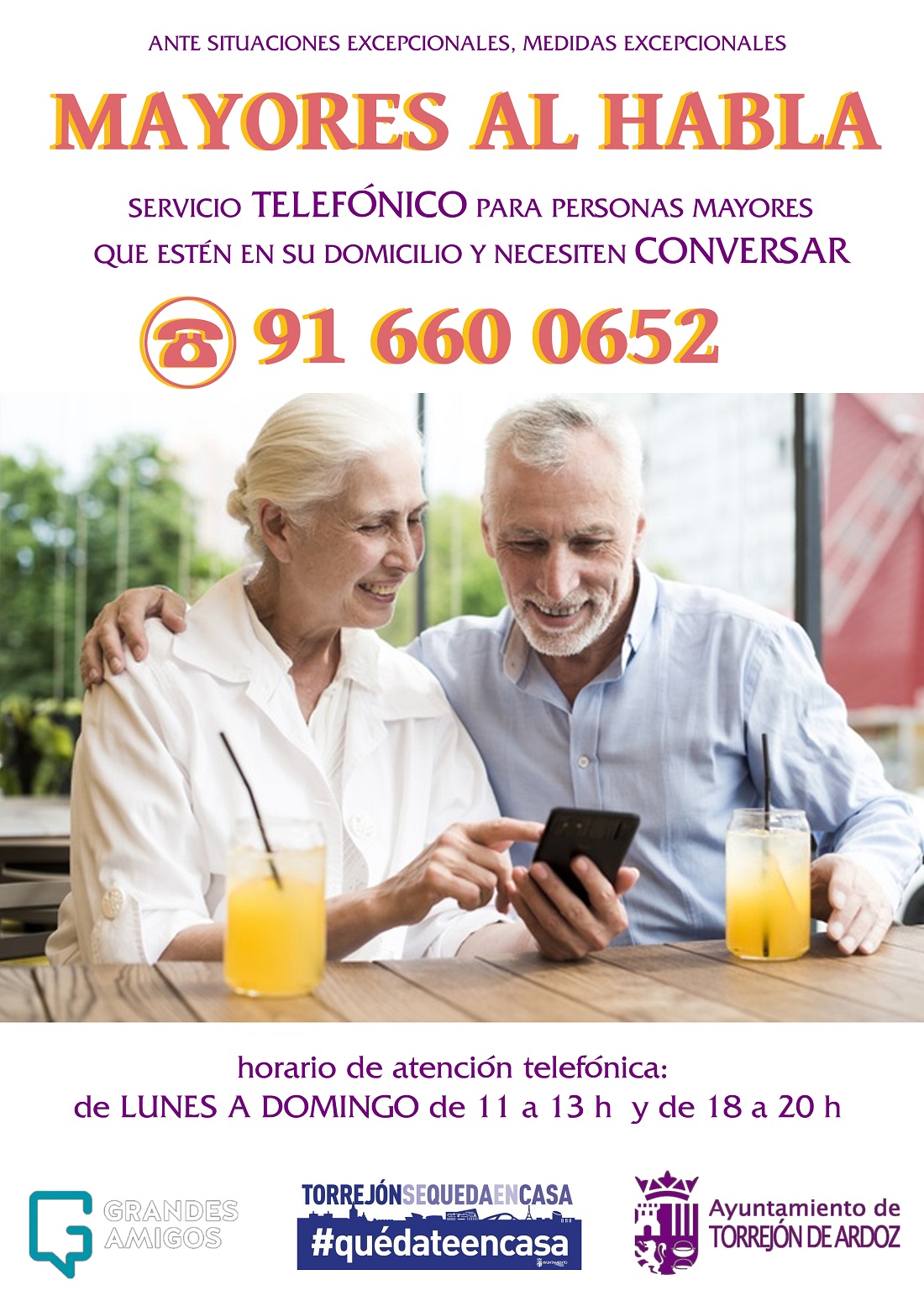Torrejón de Ardoz, 18 de marzo de 2020. De este modo, se habilita el número de teléfono 91 660 06 52 como línea abierta a todas las personas mayores que están en una situación de soledad física o psico-social, ya vivan en sus domicilios o en centros residenciales. El horario del servicio comprende de lunes a domingo de 11:00 a 13:00 horas y de 18:00 a 20:00 horas, siendo prestado en colaboración con la entidad Grandes Amigos, ONG especializada en la mejora de la calidad de vida, salud y envejecimiento con dignidad de aquella población de edad más avanzada.