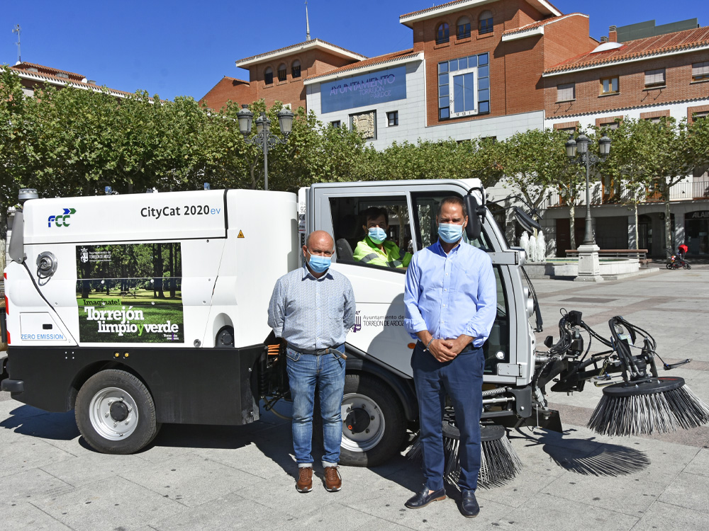 Torrejón de Ardoz, 4 de agosto de 2020. Esta nueva barredora, que ya realiza labores de limpieza en la ciudad, tiene las mismas características que el modelo anterior con motor diésel, por lo tanto, no se compromete la eficacia de la limpieza y si contribuye a mejorar el medio ambiente gracias a su motor eléctrico de cero emisiones. Una sola barredora puede evitar aproximadamente 26 toneladas de emisiones de CO2 al año.