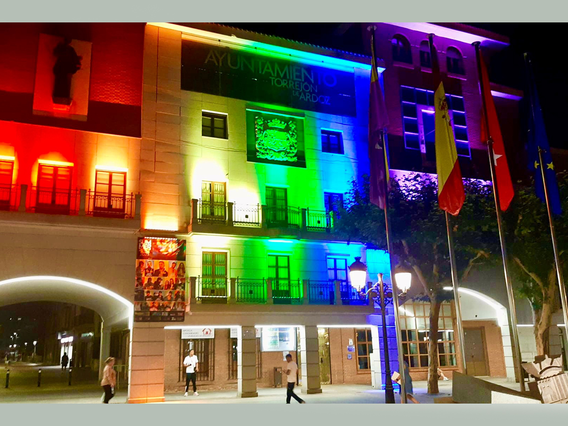 El Gobierno Local de Torrejón de Ardoz ha proyectado los colores arcoíris en la fachada del Ayuntamiento como muestra de apoyo y en defensa de los derechos del colectivo LGTBI (Lesbianas, Gays, Bisexuales y personas Transgénero) con motivo de la celebración del Día del Orgullo LGTBI.