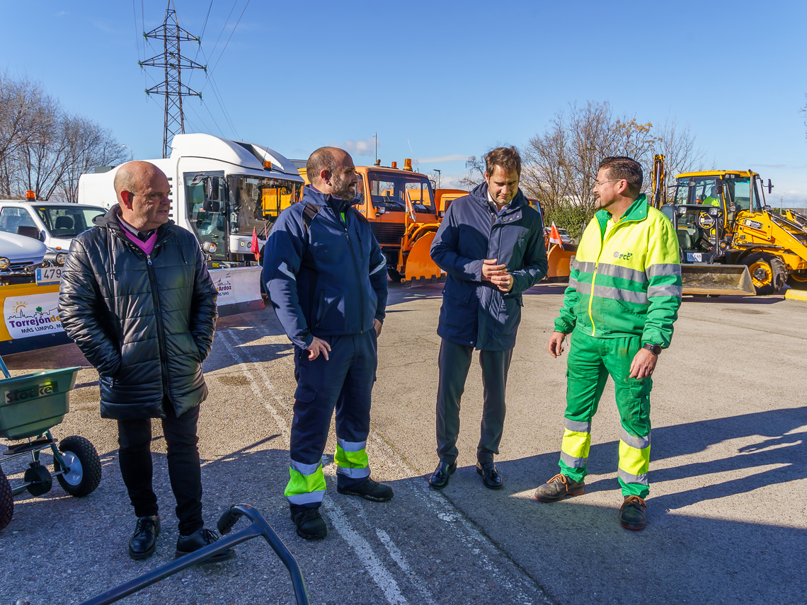 El Ayuntamiento de Torrejón cuenta con el equipamiento adecuado para hacer frente a las posibles nevadas en la ciudad. El alcalde, Ignacio Vázquez, y Valeriano Díaz, concejal de Obras, Limpieza Urbana y Administración, han presentado esta mañana el amplio dispositivo del que dispone el Consistorio, adquirido con el objetivo de dar una rápida respuesta ante la caída abundante de nieve o las heladas que se puedan producir y mejorar así la seguridad en las calles y avenidas del municipio.