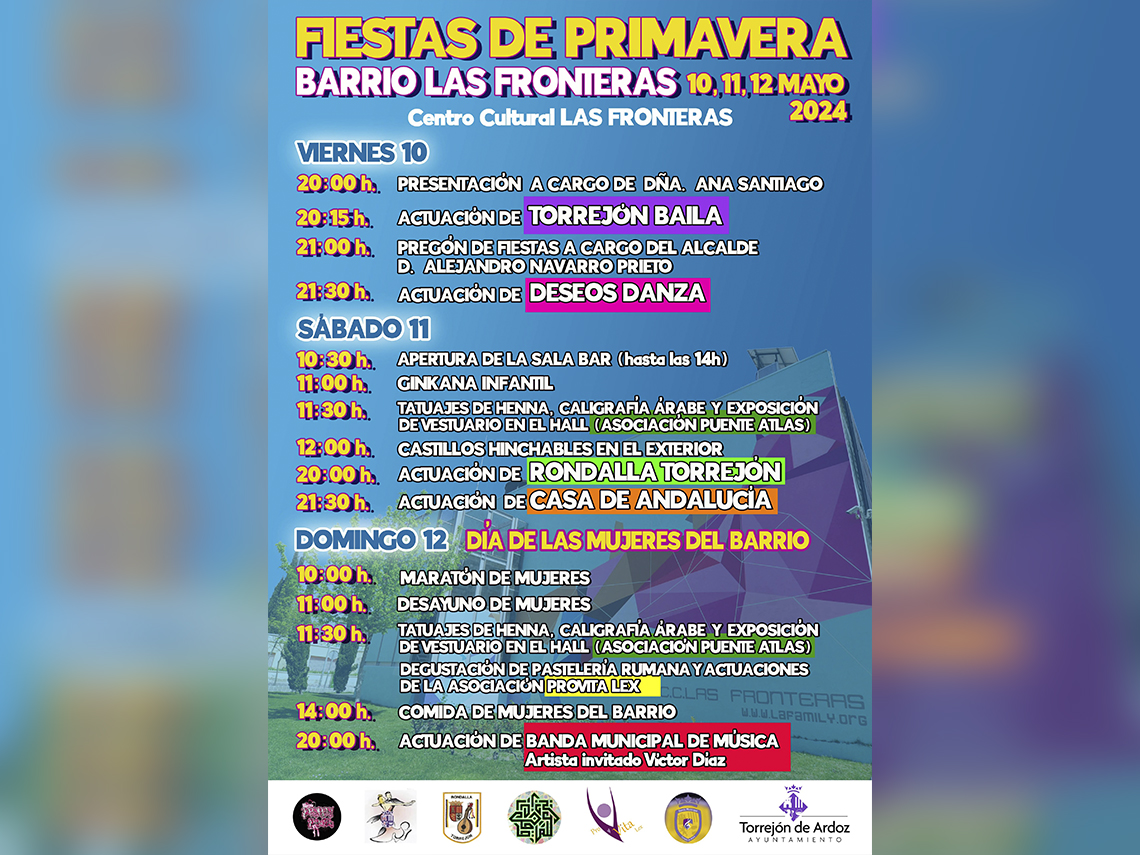 • La jornada de mañana sábado, 11 de mayo, comenzará con juegos infantiles a partir de las 11:00 horas y castillos hinchables, a las 12:00 horas. Ya a las 20:00 horas, será el turno de la actuación de la Rondalla de Torrejón y después de la Casa de Andalucía
