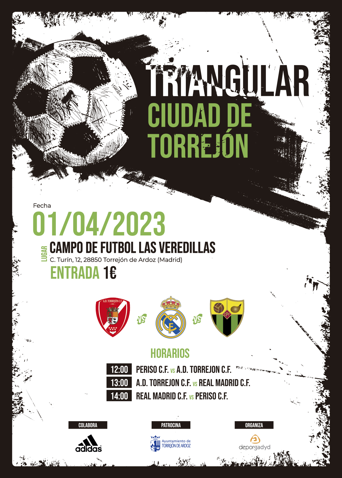 Torrejón de Ardoz, 27 de marzo de 2023. El primer partido comenzará a las 12:00 horas entre el Periso y la AD Torrejón CF. A las 13:00 horas se disputará el encuentro entre la AD Torrejón CF y el Real Madrid y, por último, a las 14:00 horas se verán las caras el Real Madrid y el Periso. La entrada para toda la jornada tendrá un precio simbólico de 1 euro.