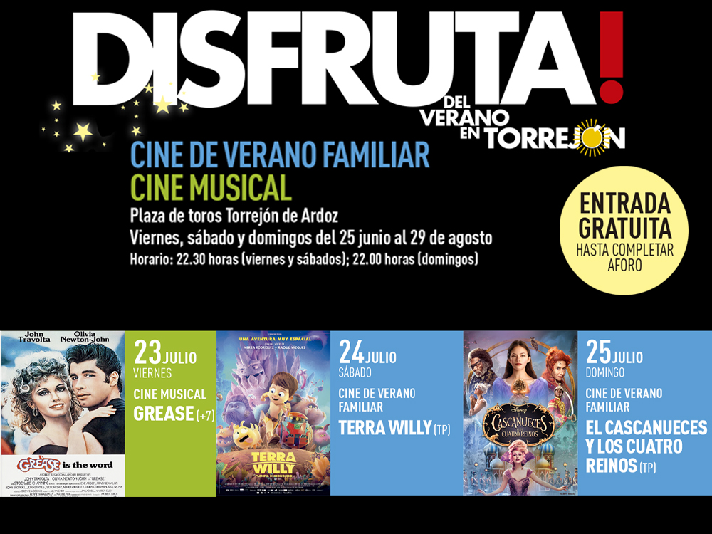 “Disfruta del Verano en Torrejón” continúa este fin de semana con el Cine de Verano Familiar y Cine Musical Así, hoy viernes 23 de julio llega “Grease”, mañana sábado 24 de julio será el turno de “Terra Willy” y el domingo 25 de julio “El Cascanueces y los cuatro reinos”. Todas las proyecciones tienen entrada gratuita hasta completar aforo y se desarrollarán en la Plaza de Toros de Torrejón de Ardoz los viernes y sábados a las 22:30 horas y los domingos a las 22:00 horas.