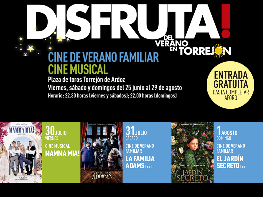 “Disfruta del Verano en Torrejón” continúa este fin de semana con el Cine de Verano Familiar y Cine Musical Así, hoy viernes 30 de julio llega “Mamma Mía”, mañana sábado 31 de julio será el turno de “La familia Adams” y el domingo 1 de agosto “El jardín secreto”. Todas las proyecciones tienen entrada gratuita hasta completar aforo y se desarrollarán en la Plaza de Toros de Torrejón de Ardoz los viernes y sábados a las 22:30 horas y los domingos a las 22:00 horas.