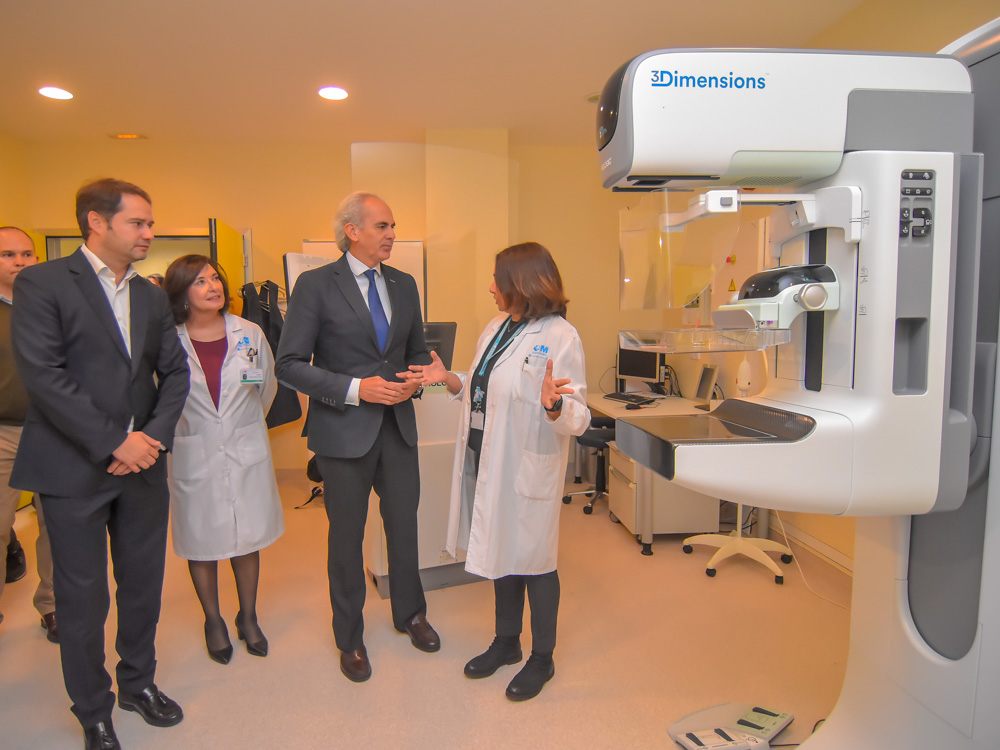 El nuevo mamógrafo 3D es un dispositivo puntero en la sanidad pública de la Comunidad de Madrid que, con un método más sensible y específico, hace posible la detección de tumores que con otros dispositivos podrían quedar ocultos. Así, este equipo crea una mamografía a partir de los datos de la tomosíntesis con solo una irradiación y, además, está dotado de la técnica de mamografía con contraste, lo cual supone una ventaja para las pacientes que no pueden someterse a una resonancia magnética y para el seguimiento de pacientes con antecedentes personales de cáncer de mama, con riesgo intermedio o con hallazgos equívocos en mamografía.