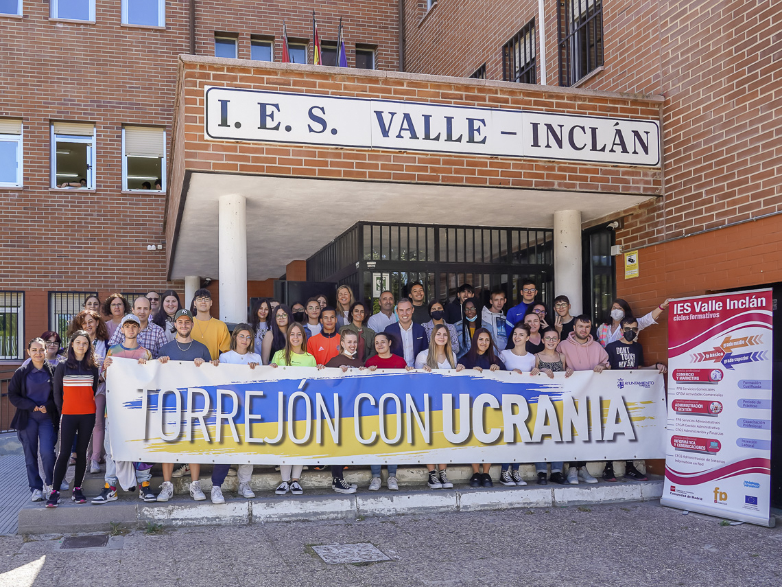 Torrejón de Ardoz continúa mostrando su solidaridad con Ucrania. En esta ocasión, ha sido el IES Valle Inclán el que puso en marcha una iniciativa para colaborar con esta causa. El concejal de Educación, Bienestar e Inmigración, Rubén Martínez, acompañado por la jefa de estudios, Begoña Sanchís, y los profesores del alumnado participante en la actividad, ha visitado esta mañana el instituto, donde los alumnos de los ciclos de FP de Administración y Comercio realizaron un mercadillo solidario con el objetivo de recaudar fondos que irán destinados a ayudar a las familias ucranianas afectadas por la guerra.