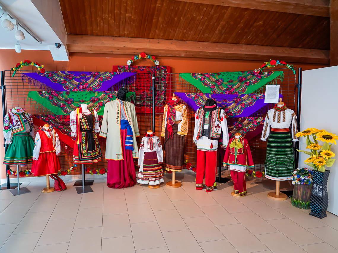 • En la exposición “En el nombre de Ucrania” se pueden ver, entre otras cosas, los trajes típicos de este país, así como una muestra de su cultura literaria. Además, también tiene especial protagonismo todo lo relacionado con la guerra que están sufriendo, como artículos militares de los soldados ucranianos que están luchando en el frente de batalla, así como fotografías de los horrores que está provocando en la población civil y la destrucción del país