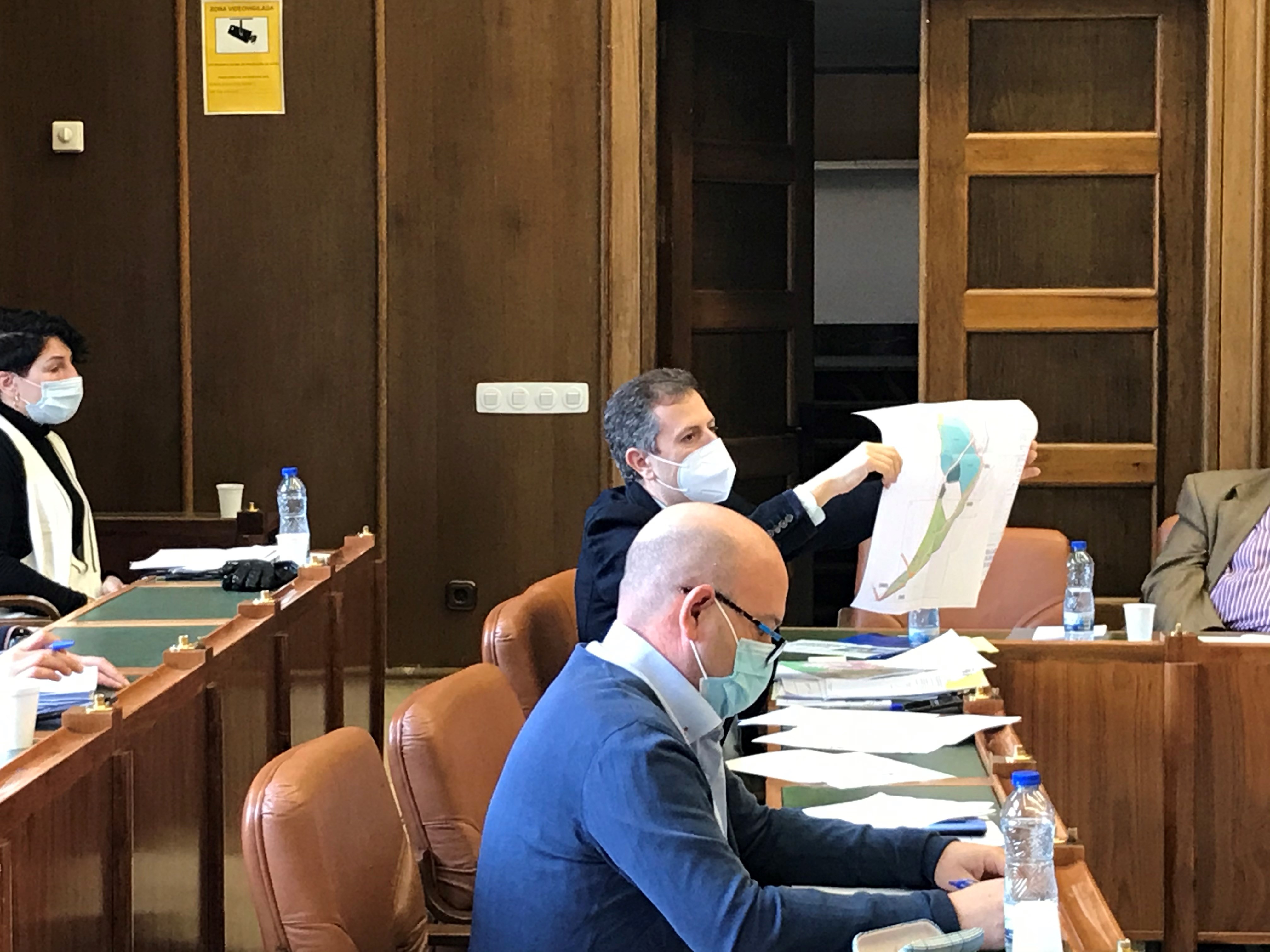 Imagen del Pleno Ordinario del mes de enero del 2021 con José Luis Navarro, portavoz del Gobierno local, enseñando el plano con los terrenos donde se completará la nueva Gran Ciudad Deportiva de Torrejón
