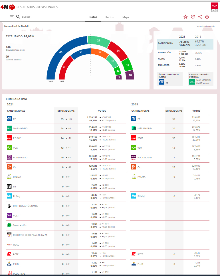 • El partido político Ciudadanos desaparece de la Asamblea de Madrid, pasando de tener 26 diputados a 0