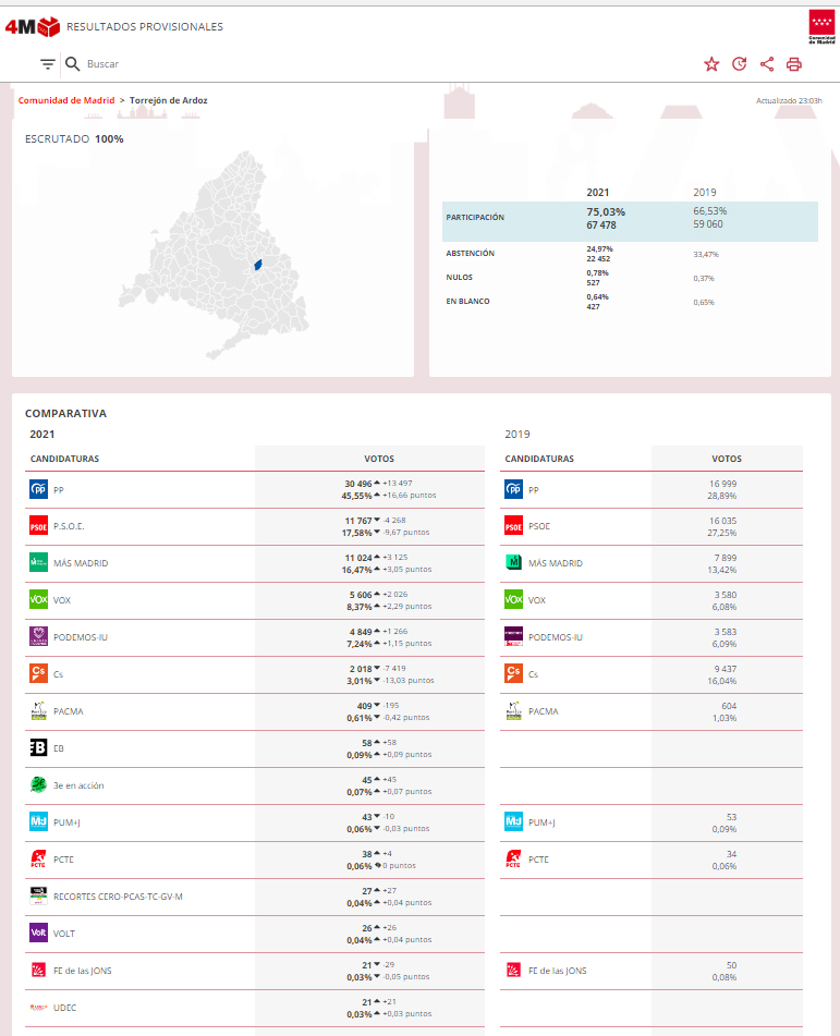 • La participación en Torrejón de Ardoz ha sido la gran protagonista de la cita electoral con un total de 67.478 votantes (75,03%), un 8,5% más que en las pasadas Elecciones Autonómicas de 2019