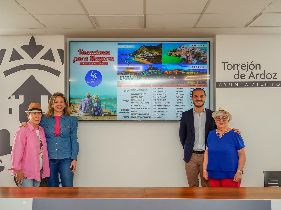 Los mayores del municipio podrán disfrutar del nuevo programa de Vacaciones de Mayores que este año incluye destinos en islas, costas, circuitos culturales y, por primera vez, un viaje fuera de España, a Praga, en la República Checa. El alcalde, Alejandro Navarro Prieto, y la concejala de Mayores y Voluntariado, Ana Verónica González, acompañados por la presidenta de la Junta Directiva de Mayores, Mª Carmen González, han presentado esta mañana la iniciativa, que está dirigida a las personas de más de 60 años jubiladas o pensionistas empadronados en Torrejón, así como a sus cónyuges. Las solicitudes están disponibles en todos los Centros de Mayores y la Concejalía de Mayores y las inscripciones se podrán realizar, el 8, 11 y 12 de marzo de forma presencial en los centros de mayores El Parque y de la avenida Madrid, en horario de 09:30 a 12:30 horas o bien por correo electrónico en mayores@ayto-torrejon.es La adjudicación de plazas se realizará por sorteo y las listas de admitidos se publicarán a partir del 15 de marzo. La inscripción permanecerá abierta durante todo el programa para cubrir bajas y vacantes.