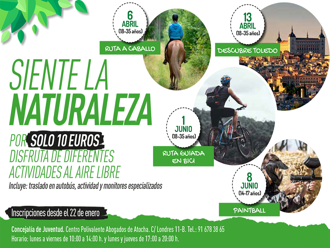 • Por otra parte, la nueva programación de las actividades al aire libre de “Siente la Naturaleza” está compuesta por Ruta a caballo (6 de abril), Descubre Toledo (13 de abril) y Ruta guiada en bici (1 de junio) para jóvenes de 18 a 35 años, y Paintball (8 de junio), para jóvenes de 14 a 17 años. Todas las excursiones tienen un precio de 10 euros e incluyen traslado en autobús, la actividad y monitores especializados