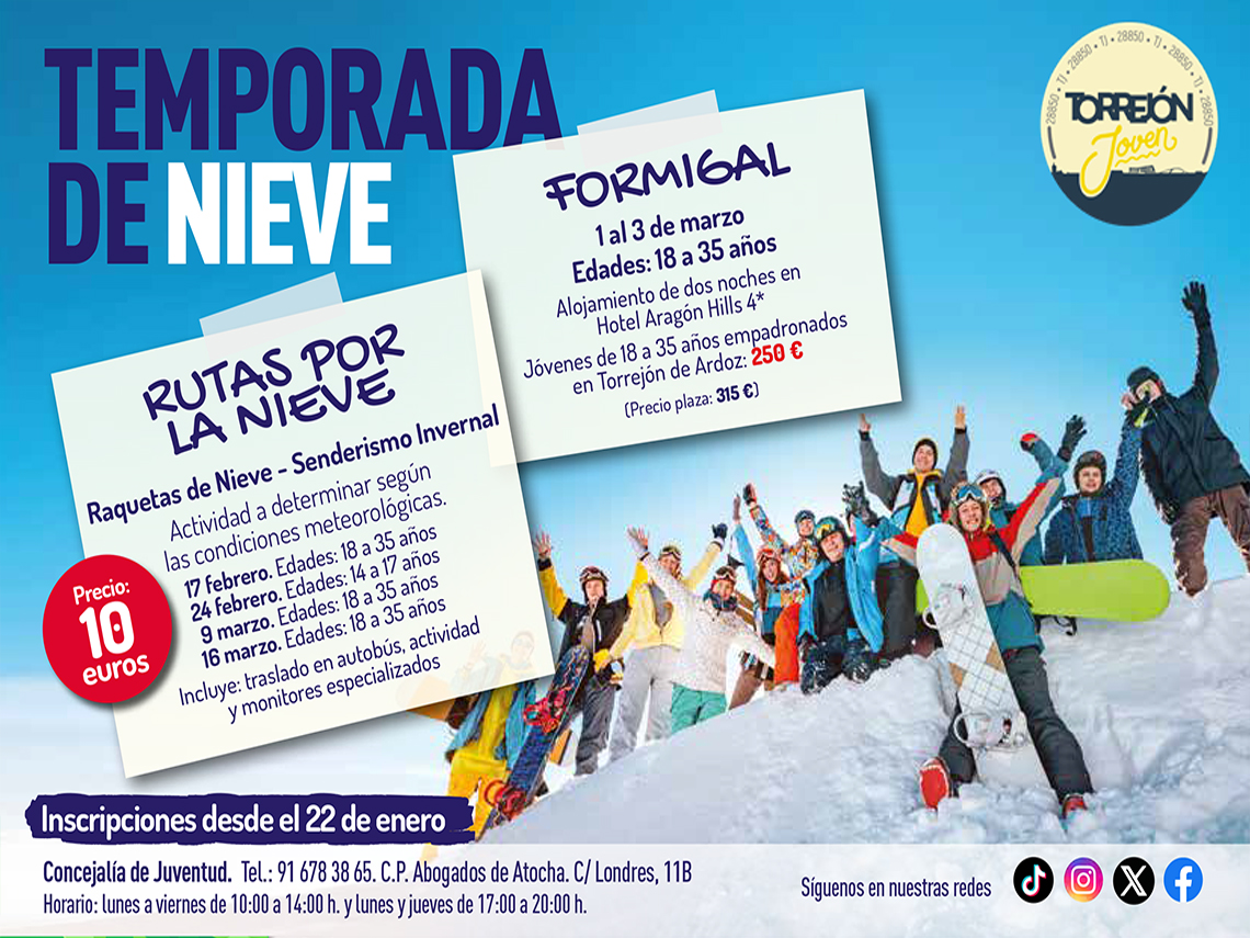 Hoy, lunes, 22 de enero, se abre el plazo de inscripción para las salidas de la temporada de nieve y las actividades de “Siente la Naturaleza” de la Concejalía de Juventud del Ayuntamiento de Torrejón