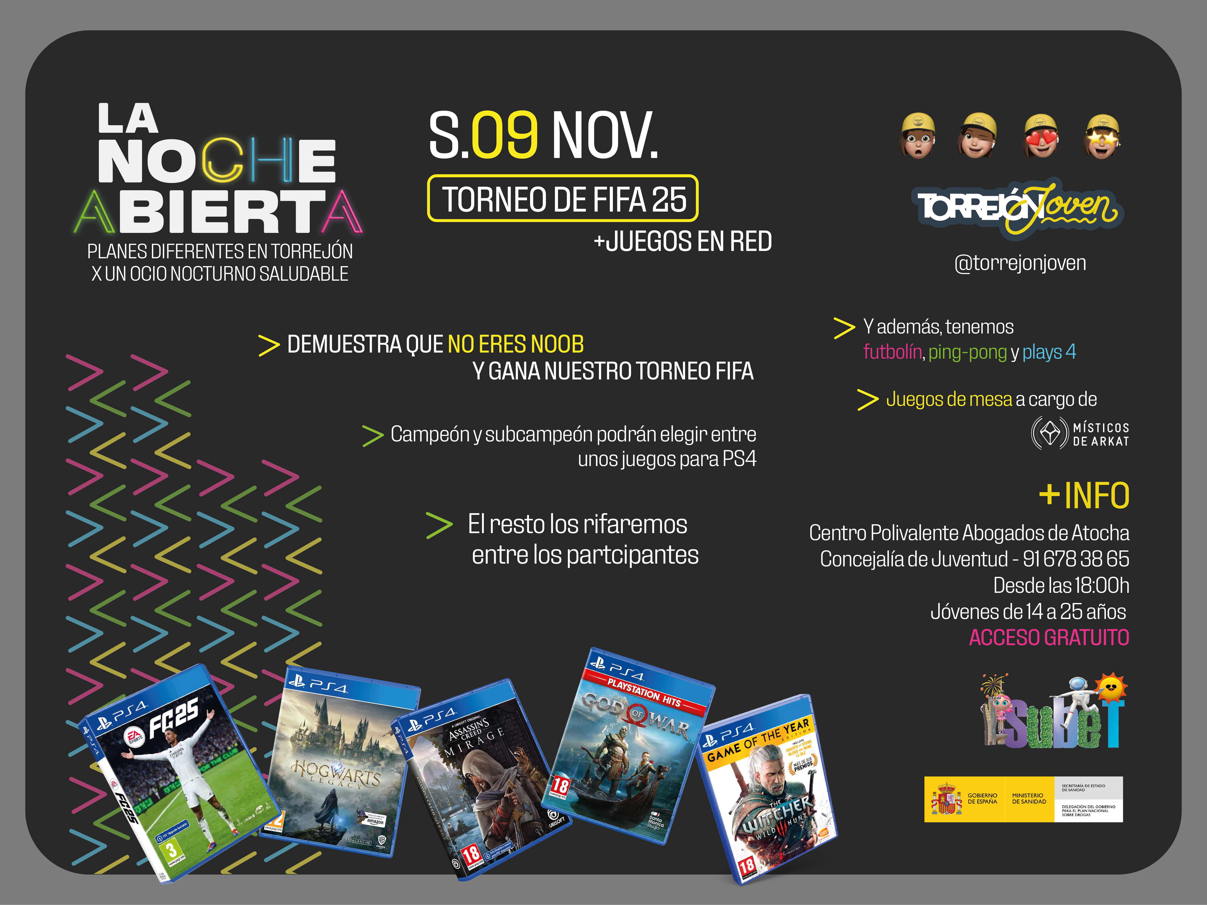 Mañana, sábado, 9 de noviembre, continúa la nueva temporada de “La Noche Abierta” con un plan perfecto para quedar con los amigos y competir en el videojuego más popular, el FIFA 25, llega a este programa de ocio para hacer las delicias de sus seguidores. Las inscripciones para el torneo se podrán realizar de 18:00 a 19:00 horas en el Centro Polivalente Abogados de Atocha, donde también se podrá disfrutar de futbolín, ping-pong, plays 4 y juegos de mesa a cargo de la Asociación Juvenil Místicos de Arkat. Además, simultáneamente se celebrarán juegos en red y habrá premios para los ganadores y sorteos entre los participantes.