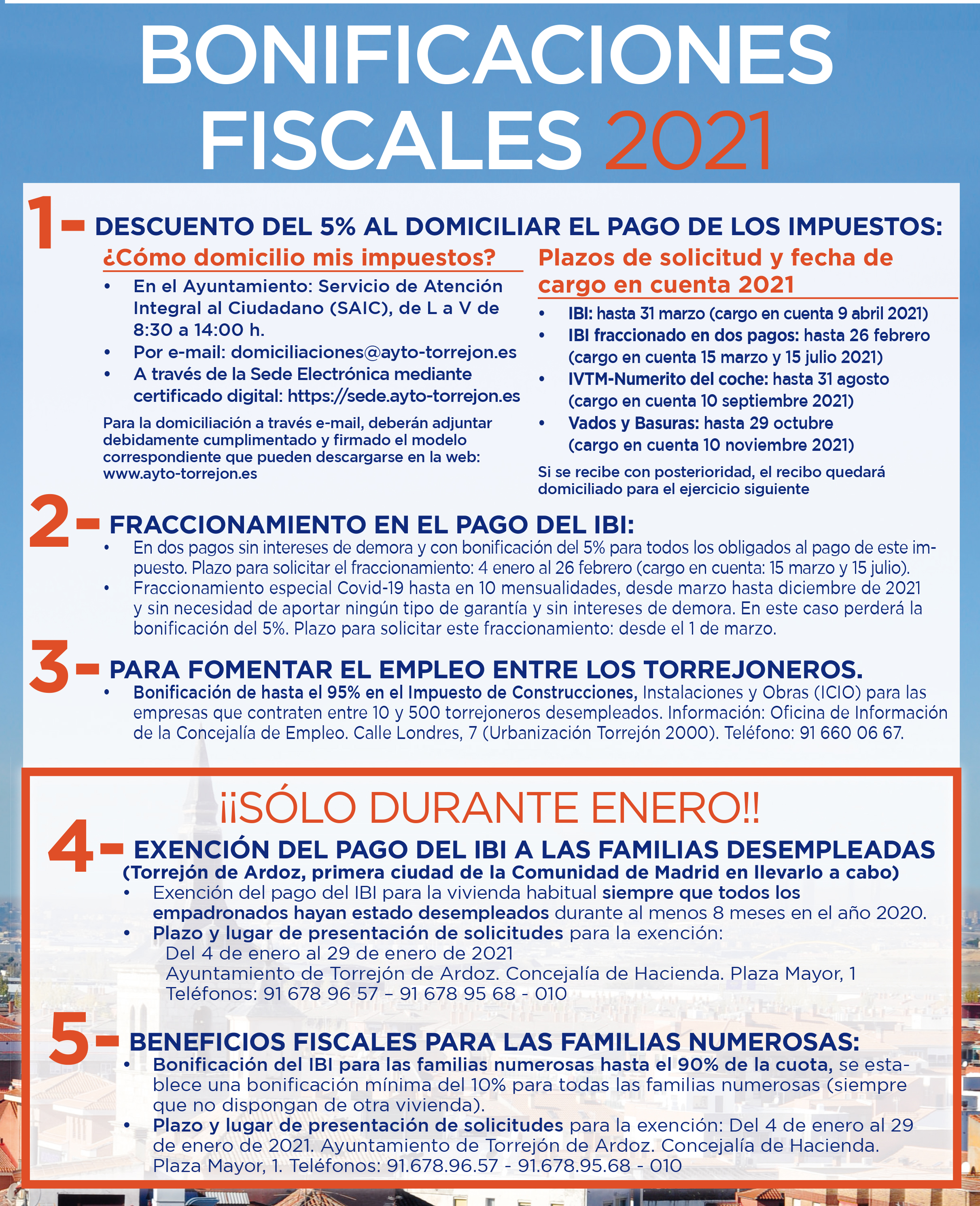 Para 2021 continuará la bajada del 5% en los impuestos municipales, a través de su domiciliación bancaria. De esta forma a los torrejoneros que tienen domiciliados sus impuestos y tasas o que lo hagan por primera vez, se les aplicará una bonificación del 5% en éstos en 2021. Además, Torrejón de Ardoz es la segunda ciudad con el IBI más bajo de la Comunidad de Madrid. Algunas de estas medidas forman parte del Pacto Torrejón Solidario acordado por el alcalde y los tres grupos con representación municipal.