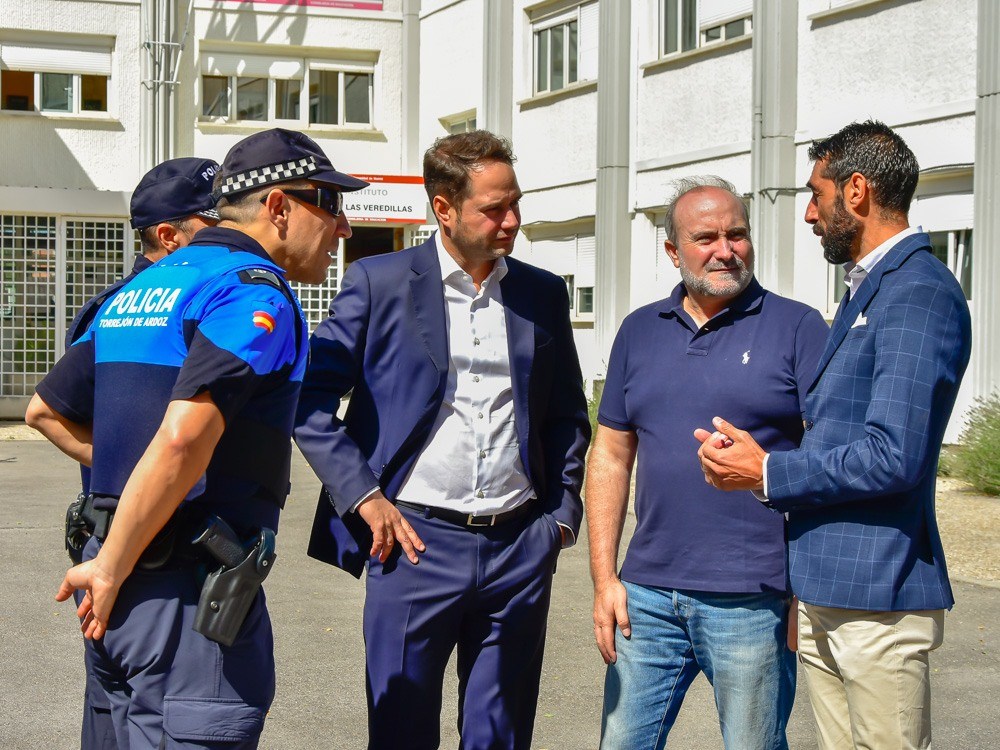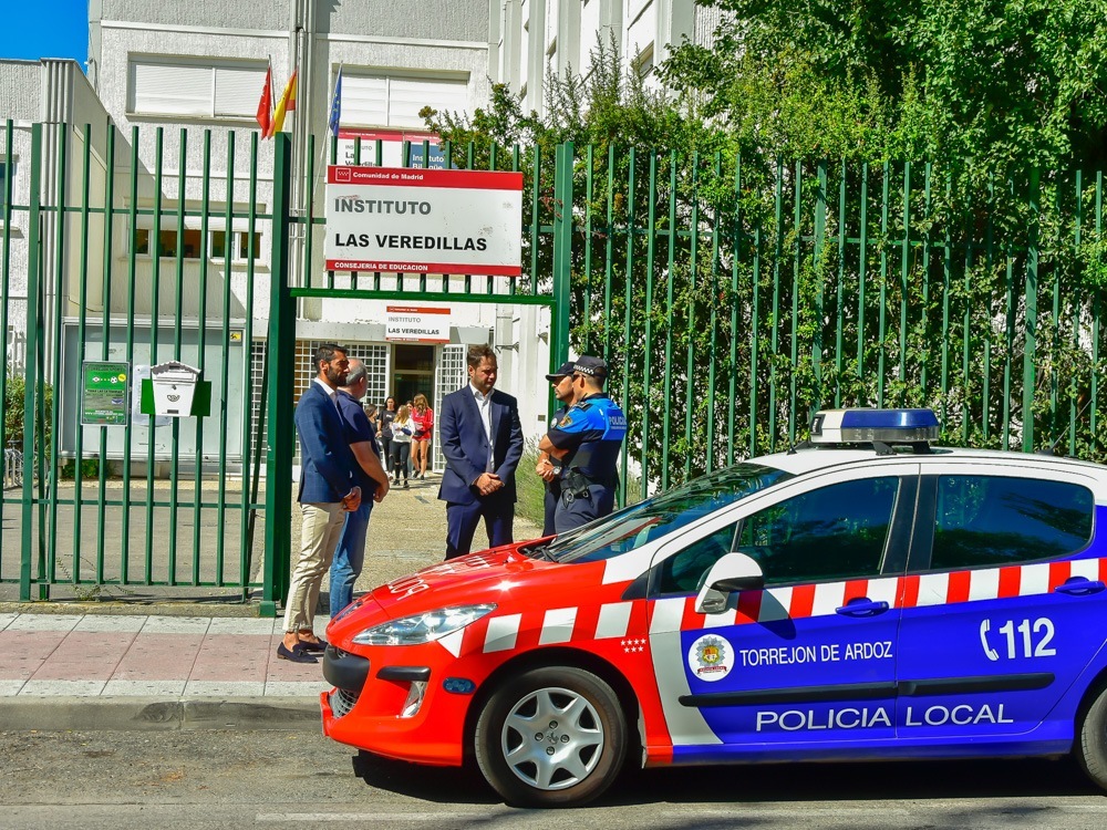 El alcalde de Torrejón de Ardoz, Ignacio Vázquez y el concejal de Seguridad, Juan José Crespo, acompañados del director del Instituto Las Veredillas, Tomás Martín presentaron en este centro una nueva edición del “Plan de Prevención de las Novatadas en los Institutos” que ha logrado erradicar las gamberradas más graves en estos centros educativos de Torrejón en el inicio del curso escolar. El objetivo de este dispositivo policial es la prevención de novatadas a los nuevos alumnos de los institutos en los primeros días del curso escolar. Para ello en cada uno de los 8 institutos públicos con los que cuenta la ciudad habrá una pareja de agentes que velará para que estos hechos no ocurran.