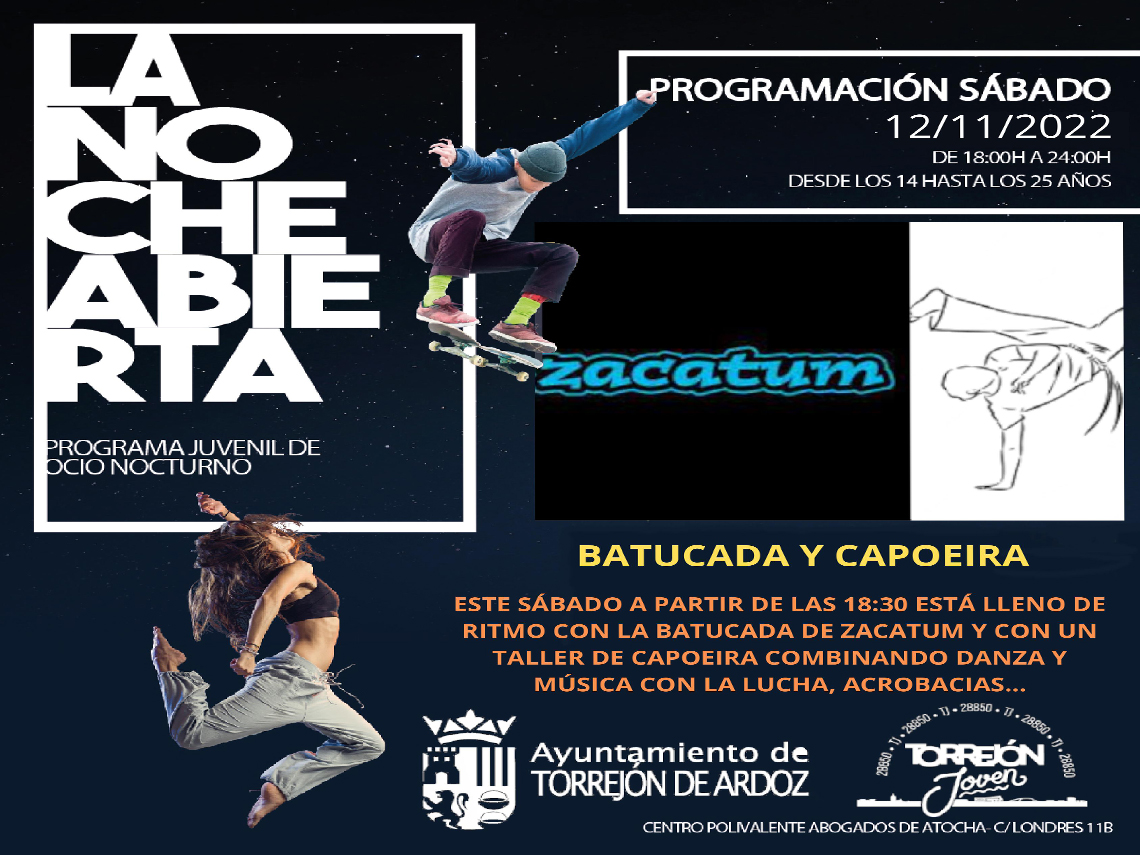 • Ritmo sin parar este sábado con la batucada de Zacatum y un taller de capoeira, a partir de las 18:30 horas, combinando danza y música con la lucha y las acrobacias dentro de “La Noche Abierta”, un programa con alternativas de ocio nocturno saludable para jóvenes de 14 a 25 años con actividades especiales que se adaptan a todos los gustos