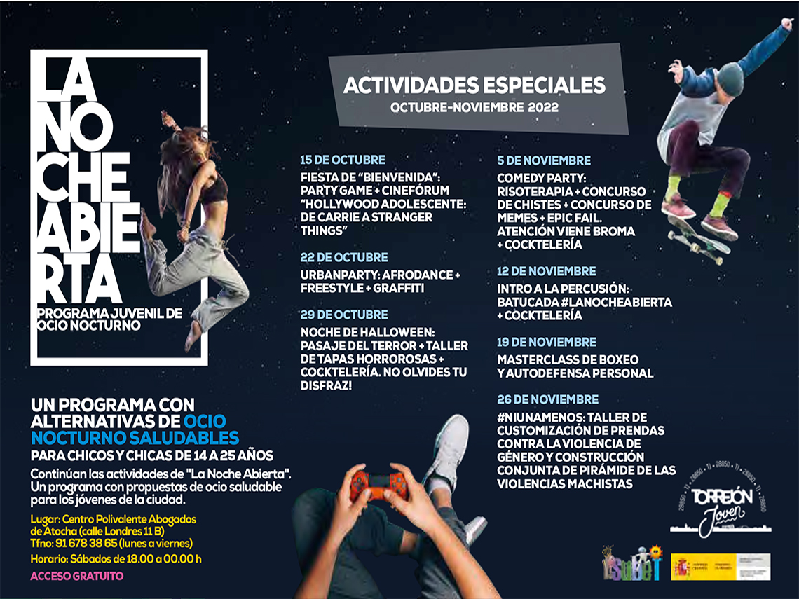 • “La Noche Abierta” es un programa con alternativas de ocio nocturno saludable para jóvenes de 14 a 25 años con actividades especiales que se adaptan a todos los gustos. Entre ellas, durante este mes de octubre también tendrán lugar una Urbanparty con Afrodance, Freestyle y Grafiti (22 de octubre) y la noche de Halloween con pasaje del terror, taller de tapas horrorosas y coctelería (29 de octubre)