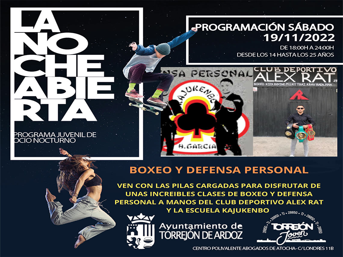 El Ayuntamiento de Torrejón de Ardoz, a través de su Concejalía de Juventud, ofrece un amplio programa de actividades para los jóvenes de la ciudad. Así, este sábado 19 de noviembre continúa la nueva temporada de “La Noche Abierta” en la que hará falta tener las pilas bien cargadas, ya que contará con una clase de boxeo a las 18:30 horas a cargo del Club Deportivo Alex Rat y otra de Defensa Personal que impartirá la Escuela Kajukenbo a partir de las 19:30 horas. Todo esto se suma al resto de actividades que hay de forma habitual, como los juegos de mesa, en colaboración con la Asociación Juvenil Místicos de Arkat, las partidas de PS4 con juegos como el FIFA 23, futbolín, ping pon o karaoke. La cita tendrá lugar en el Centro Polivalente Abogados de Atocha, con acceso gratuito hasta completar aforo.
