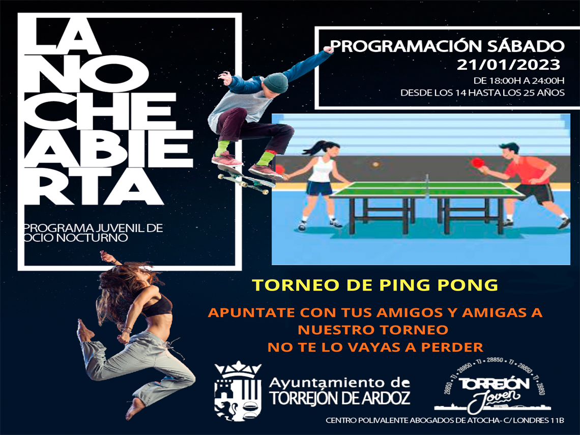 El juego de tenis de mesa por excelencia aterriza en Torrejón de Ardoz. Mañana sábado, 21 de enero, continúa la iniciativa gratuita de ocio alternativo para jóvenes “La Noche Abierta” que en esta ocasión llega con un torneo de ping pong. La cita tendrá lugar a partir de las 18:00 horas en el Centro Polivalente Abogados de Atocha, donde también se podrá disfrutar del resto de actividades que hay de forma habitual, como los juegos de mesa, en colaboración con la Asociación Juvenil Místicos de Arkat, las partidas de PS4 con juegos como el FIFA 23, futbolín o karaoke. La entrada es gratuita hasta completar aforo.