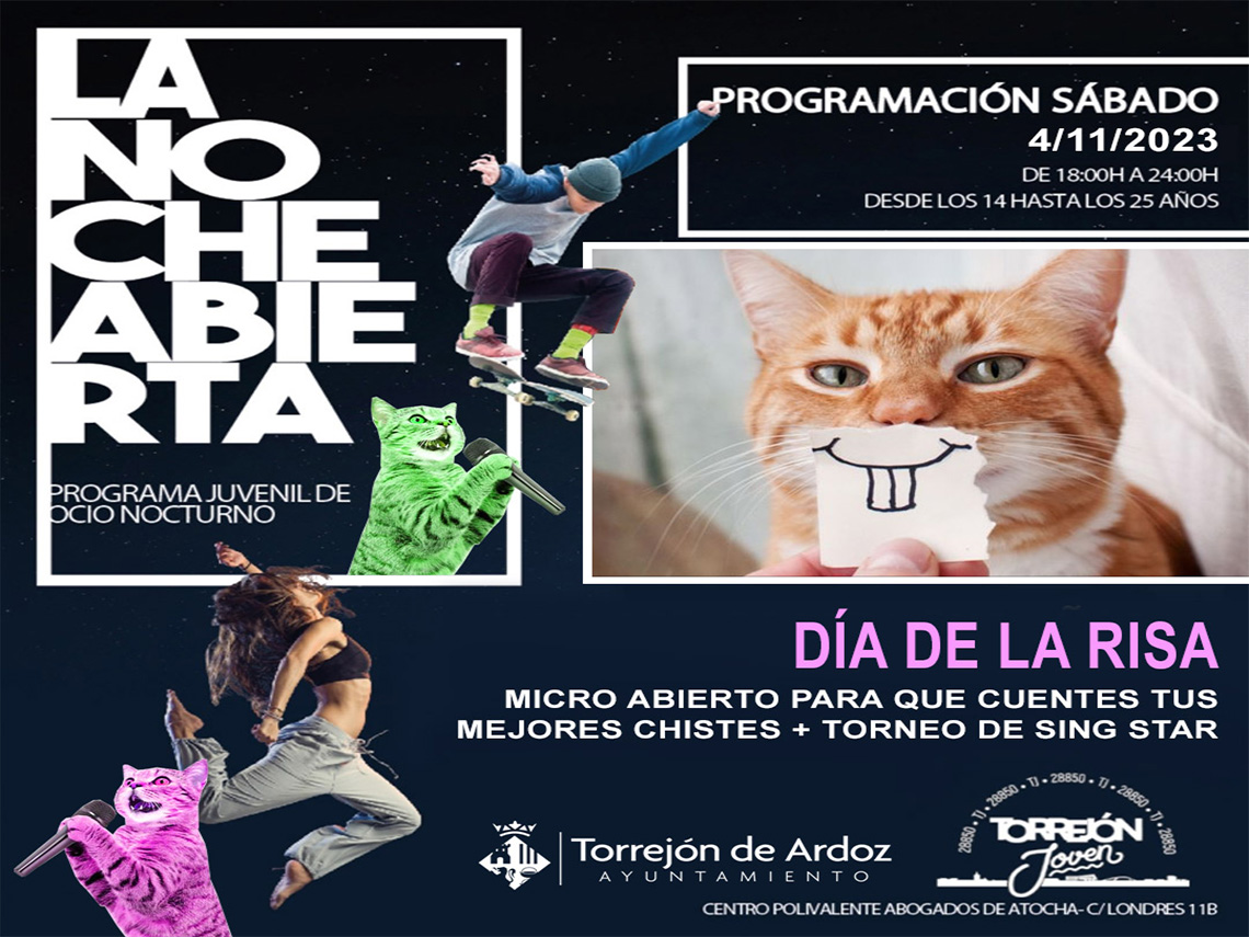Si te apetece pasar una tarde divertida no te puedes perder La Noche Abierta de mañana, sábado, 4 de noviembre, con “El día de la risa”, en el que habrá micro abierto para que cuentes tus mejores chistes y un torneo de Sing Star. La cita será a partir de las 18:00 horas y también se podrá disfrutar de juegos de mesa, a cargo de la Asociación Juvenil Místicos de Arkat, partidas de PS4, futbolín y ping-pong.